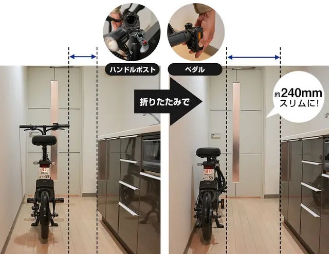 ハンドルポストと足置きのペダル部分がワンタッチで折りたたみできるので、非常にコンパクトになります。