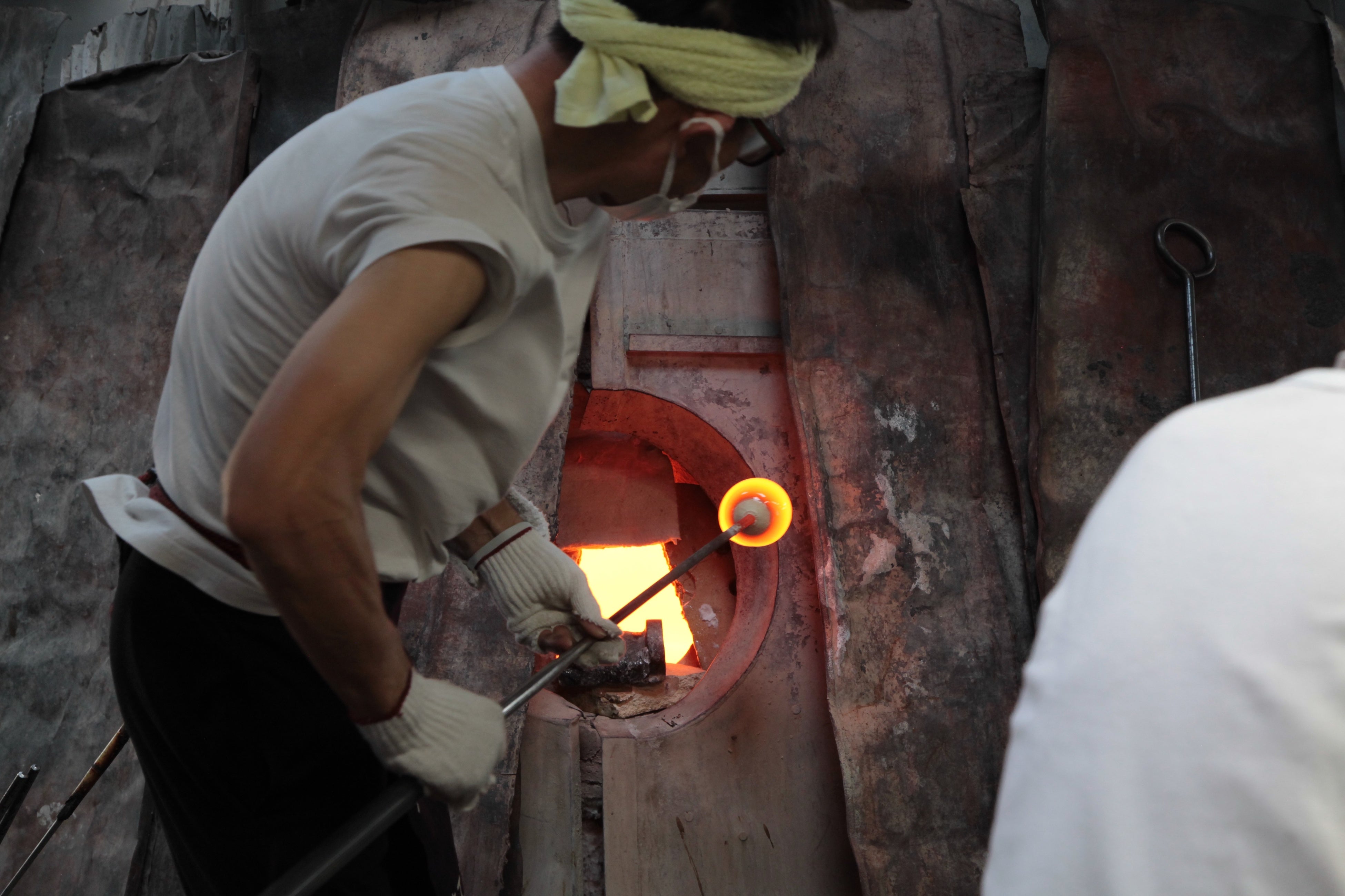 初の夏日とも言われた2023年6月某日、1000℃を超える窯の前で、長時間、職人の方々によって丁寧に作られるガラスボトルは、一つとして同じものがない、字の如く一点もの。機械による大量生産が当たり前になってしまった世の中で、世界に誇れる日本の高い職人技術が活用の場を縮小せざるを得ない現実に、GREYCHORDとしてできることはその技術を生かして、それを大切に使ってもらうことと考えています。