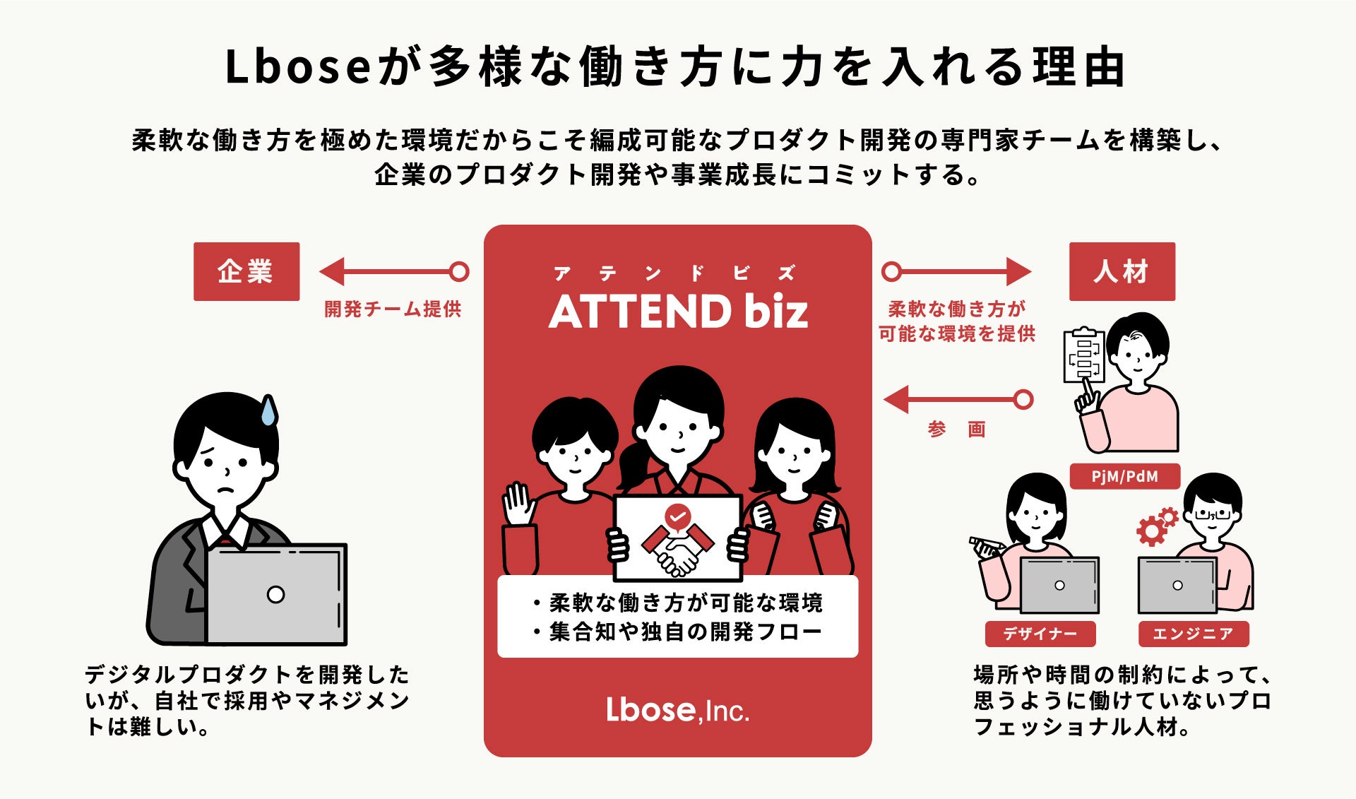 通常、柔軟な働き方の推進とマネジメントコストの増加は相反する関係にあるため、多くの企業では柔軟な働き方を求める人材をうまく活用できていません。このような状況に対しATTEND bizでは人材が本当に求めている働き方を整備することでメンバー募集し、リソースを必要とする企業へ提供を行っています。