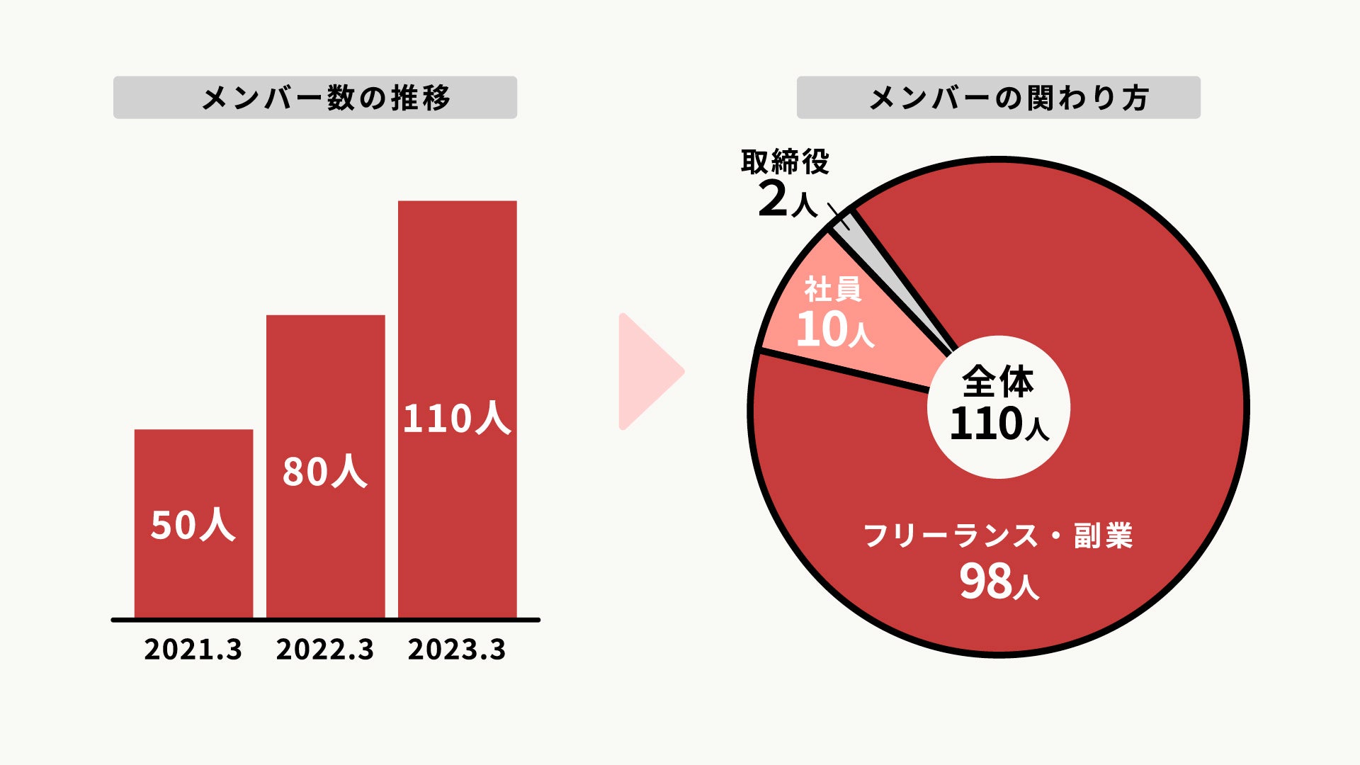 メンバー数は創業時から右肩上がりで増加。フリーランス・副業メンバーが全体の約90%を占める中、フリーランスのように柔軟に働ける正社員の数も10名まで増加しました。