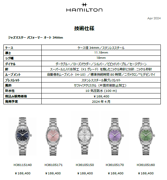 高い性能と革新性、そして洗練された美しさのバランスが取れた「ジャズマスター パフォーマー」コレクションは、大胆で個性的な42mm径モデルから、多用途で洗練された38mm径から34mm径のモデルまで、サイズ、カラー、フィニッシュのバリエーションが豊富なため、ユニセックスで使えるモデルに仕上がっています。新しいモデル加わったことにより、コレクション特有のモダンでクラシックの魅力もさらに増しています。