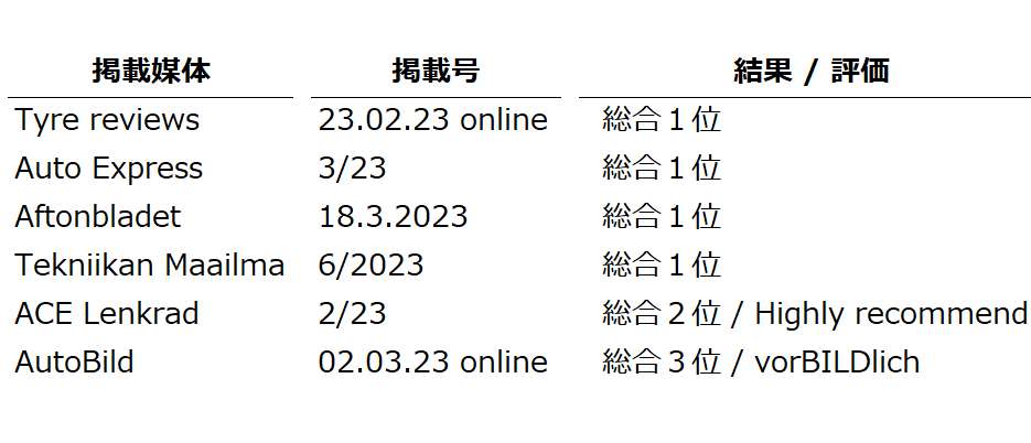 コンフォートタイヤカテゴリーの新フラッグシップタイヤ「PremiumContact 7」は、6つのサマータイヤテストの内4つで総合1位を獲得。タイヤに求められる性能のトータルバランスの高さやウエットパフォーマンスに優れた安全性の高さが評価されました。