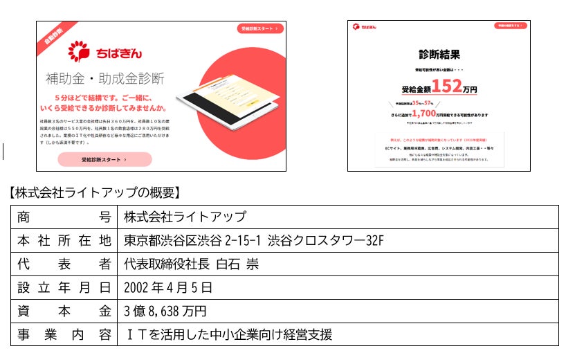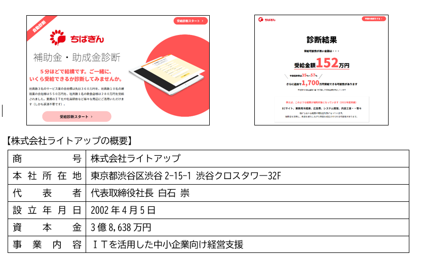 「Jシステム」は、株式会社ライトアップ(代表取締役社長 白石 崇)よりOEM提供を受けて取扱いを開始するもので、最新の補助金・助成金の受給金額の目安について無料かつ数分で自動診断できるシステムです。