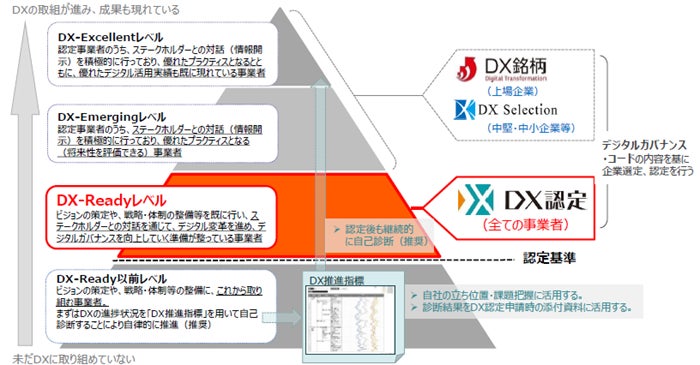 DX認定制度は、デジタル技術による社会変革に対して経営者に求められる事項を取りまとめた「デジタルガバナンス・コード」に対応し、DX推進の準備が整っていると認められた企業を国が認定する制度です。認定事業者は「企業がデジタルによって自らのビジネスを変革する準備ができている状態(DX-Ready)」とされ、ステークホルダーに対するプレゼンスの強化が図れ、また公的な支援措置を受けることもできる制度となります(認定の適用期間:2年間)。