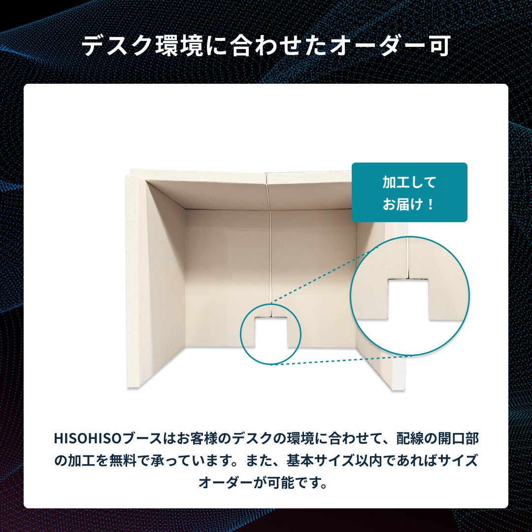 HISOHISOブースはお客様のデスクの環境に合わせて、配線の開口部の加工を無料で承っています。また、基本サイズ以内であればサイズオーダーが可能です。