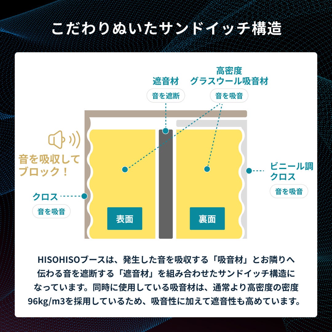HISOHISOブースは、発生した音を吸収する「吸音材」 とお隣りへ伝わる音を遮断する「遮音材」を組み合わせたサンドイッチ構造になっています。同時に使用している吸音材は、通常よりもさらに高密度の密度96kg/m3を採用しているため、吸音性に加えて遮音性も高めています。