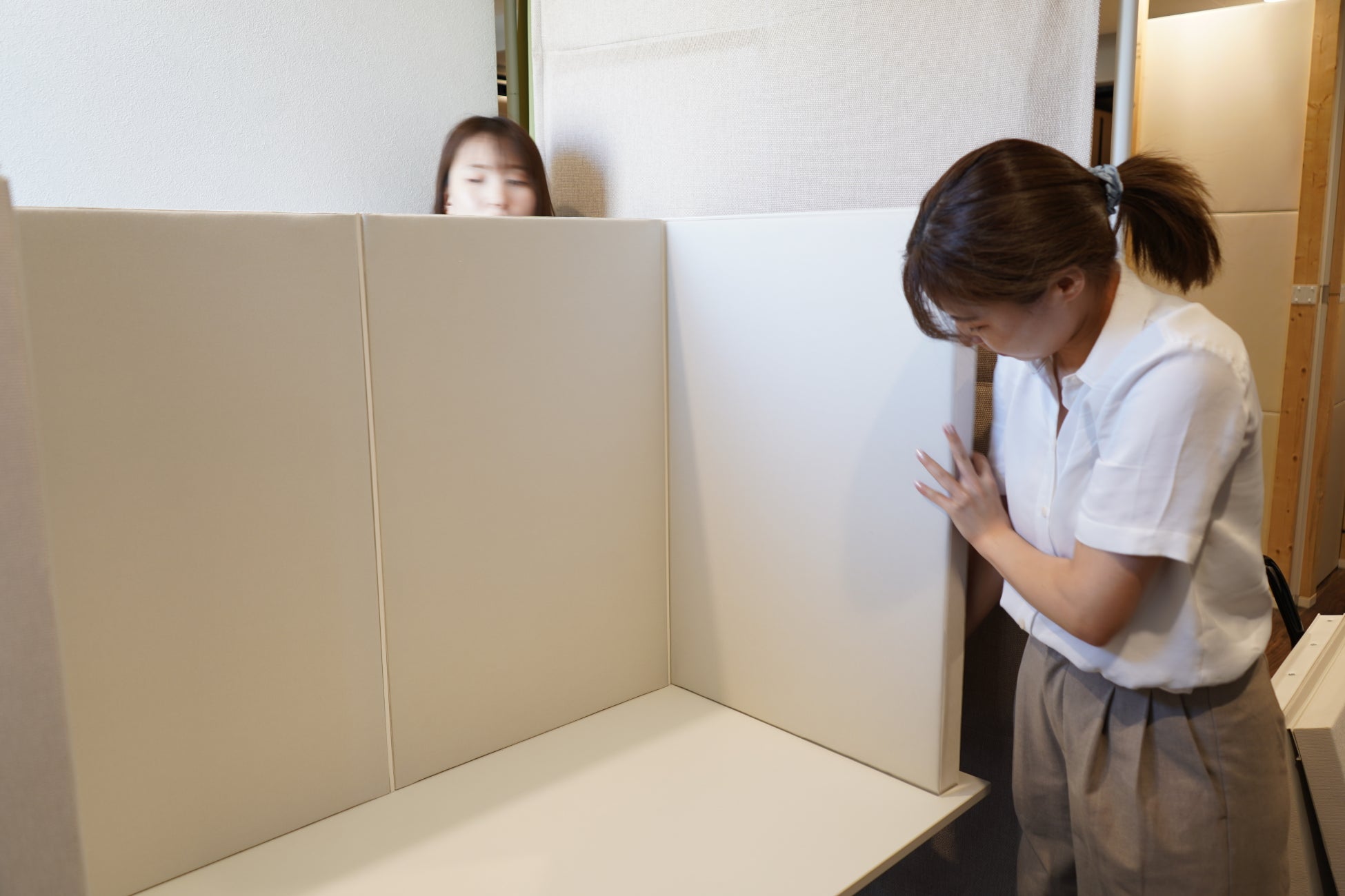 「HISOHISOブース」は、高密度吸音材と遮音材のたサンドイッチ構造で、簡易防音室にも劣らない防音効果が期待できます。サイズ調整や配線用の開口部のカット加工などのオーダーができ、あらゆるデスク環境に対応が可能です。