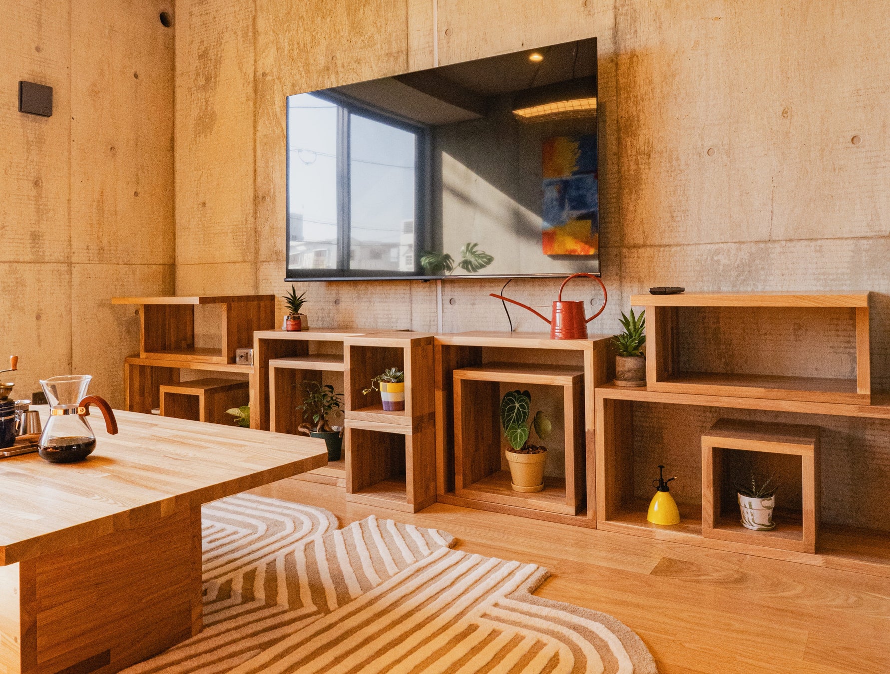空間の中に自然に溶け込んだ150mm単位の家具たちを、実際に手に取り、動かしながら、自由に使ってみていただけます。スツールに座ってみる。サイドテーブルとして置いてみる。いくつか積み上げて収納棚にしてみる──使い方は、あなた次第です。