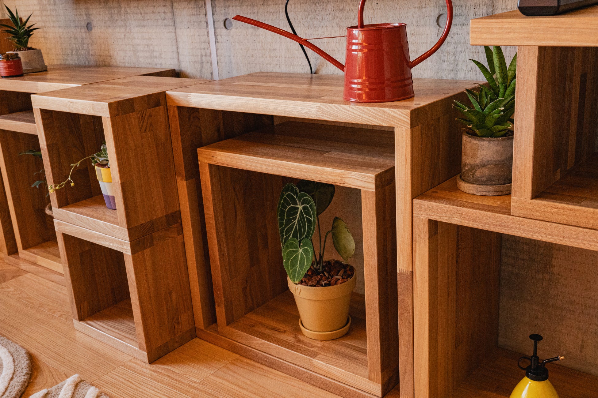 たとえば、150mm角の最小サイズはスツールや踏み台に。300mm〜450mmサイズはサイドテーブルや収納棚、600mmの大型モジュールはTVボードやベンチとして活躍します。
