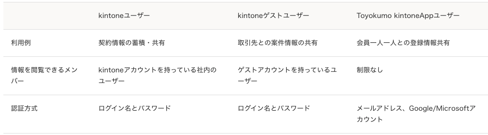 トヨクモのkintone連携サービスにアクセスするための認証の仕組みです。Toyokumo kintoneApp認証を利用することで、kintoneのアカウントを持っていない社外の取引先や顧客、アルバイトとの情報共有を「よりセキュアに」「よりカンタン」に行うことができます。