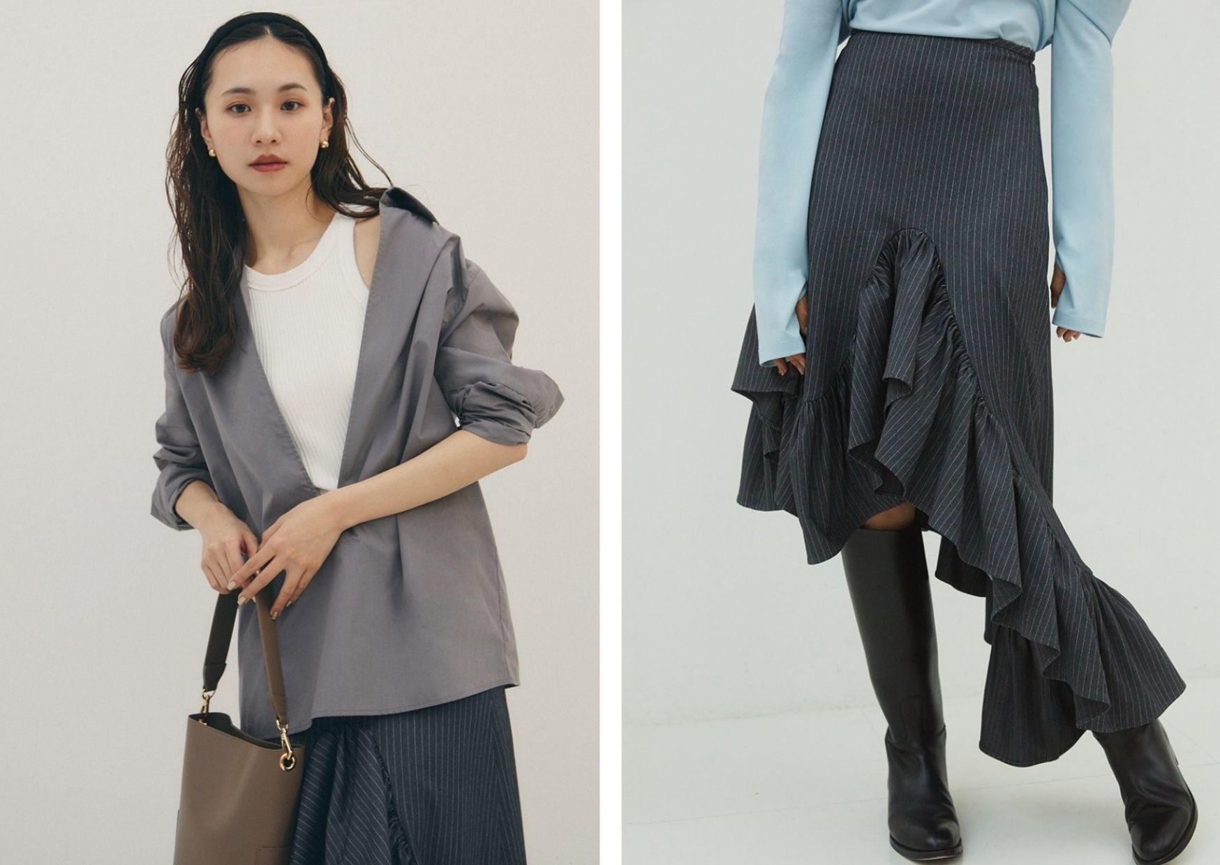 写真右▼Asymmetry long skirt (stripe/black) ¥11,000(税込)
