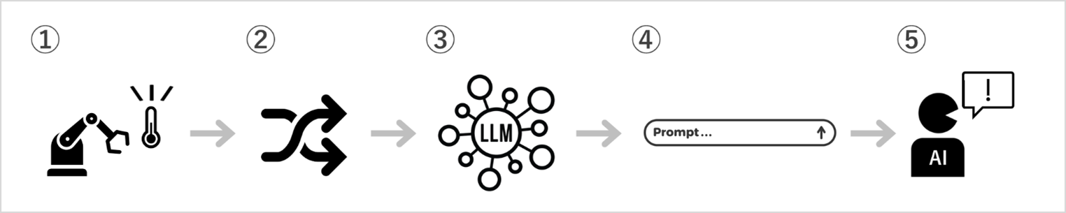 ⑤工場のスピーカーや設備を制御するコンピューター上で、AI(安全保安員)が、たとえば「この製造機械内の温度が〇度になっています。機械を運転させる手順が誤っている可能性があります。品質問題に発展するおそれがあるため、機械を再起動し手順書どおりに始動してください」と注意を促す