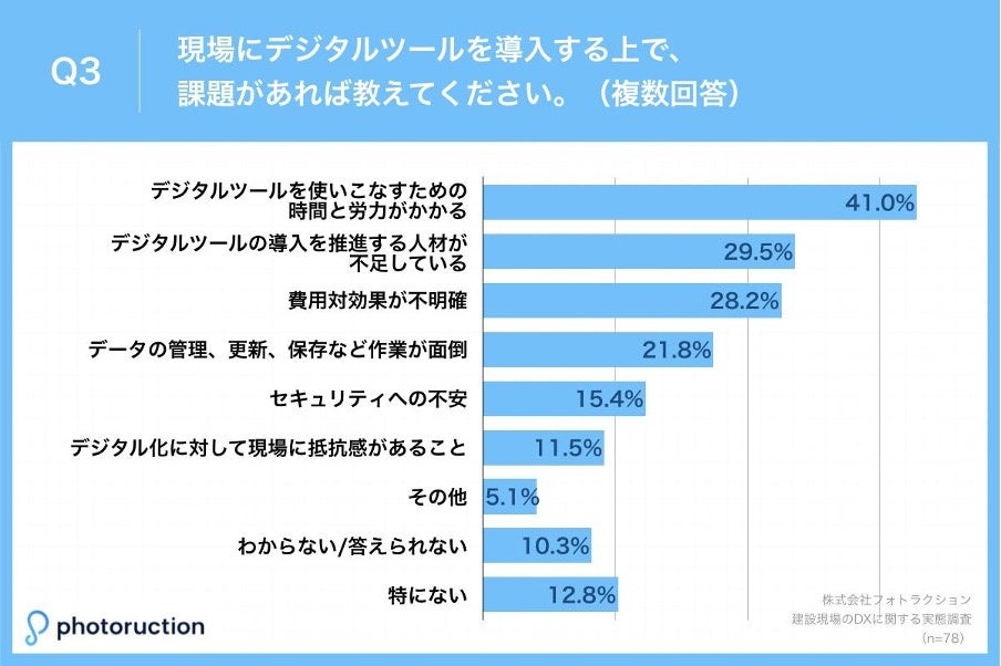 Q2で「導入していない」と回答した方に、「Q3.現場にデジタルツールを導入する上で、課題があれば教えてください。(複数回答)」(n=78)と質問したところ、「デジタルツールを使いこなすための時間と労力がかかる」が41.0%、「デジタルツールの導入を推進する人材が不足している」が29.5%、「費用対効果が不明確」が28.2%という回答となりました。