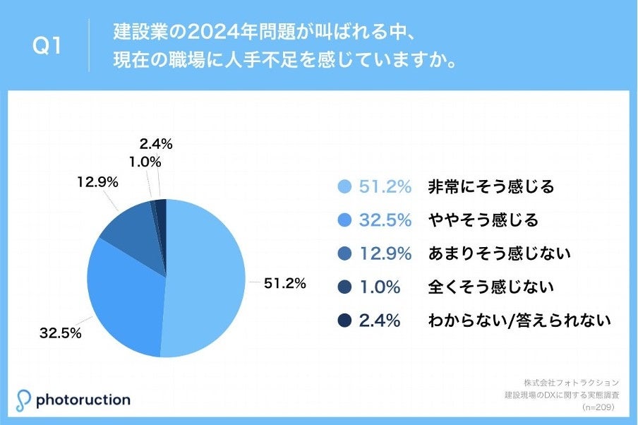 「Q1.建設業の2024年問題が叫ばれる中、現在の職場に人手不足を感じていますか。」(n=209)と質問したところ、「非常にそう感じる」が51.2%、「ややそう感じる」が32.5%という回答となりました。