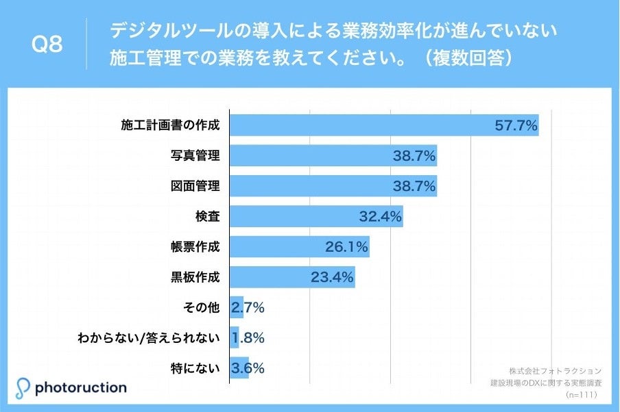 Q2で「積極的に導入している」「導入している」と回答した方に、「Q8.デジタルツールの導入による業務効率化が進んでいない施工管理での業務を教えてください。(複数回答)」(n=111)と質問したところ、「施⼯計画書の作成」が57.7%、「写真管理」が38.7%、「図⾯管理」が38.7%という回答となりました。