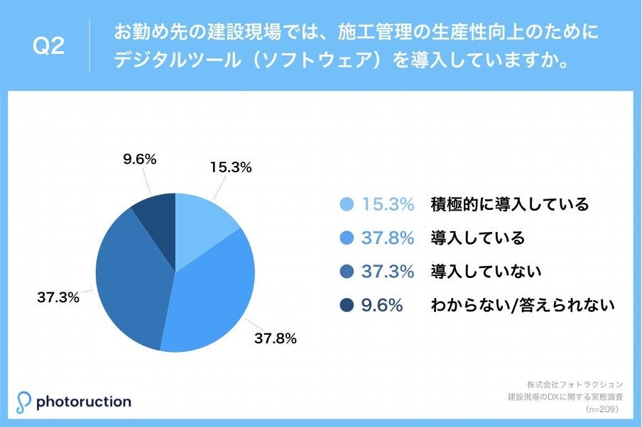 「Q2.お勤め先の建設現場では、施工管理の生産性向上のためにデジタルツール(ソフトウェア)を導入していますか。」(n=209)と質問したところ、「積極的に導入している」が15.3%、「導入している」が37.8%という回答となりました。