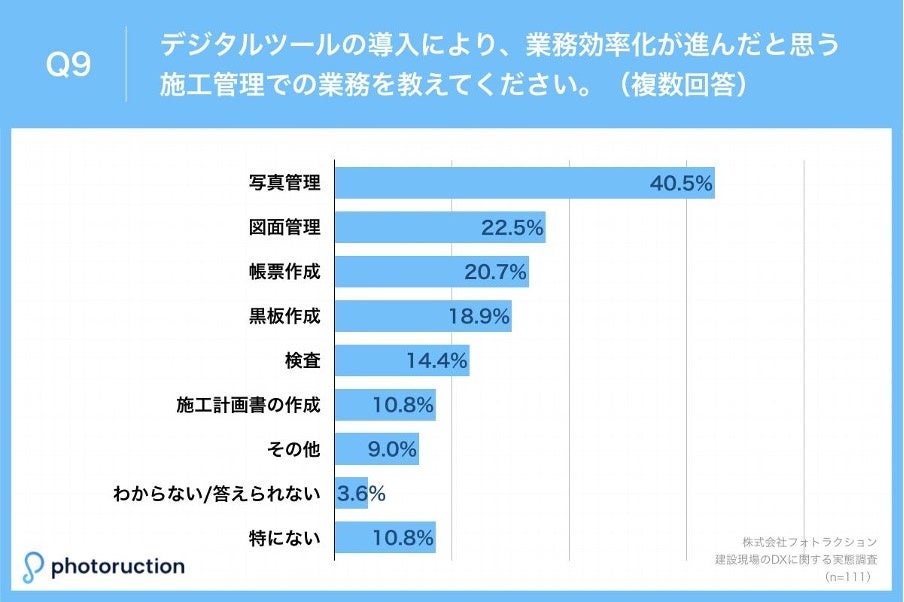 Q2で「積極的に導入している」「導入している」と回答した方に、「Q9.デジタルツールの導入により、業務効率化が進んだと思う施工管理での業務を教えてください。(複数回答)」(n=111)と質問したところ、「写真管理」が40.5%、「図⾯管理」が22.5%、「帳票作成」が20.7%という回答となりました。
