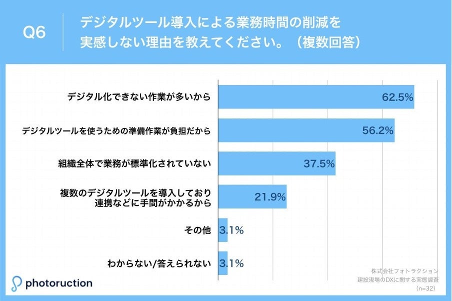Q4で「あまりそう感じない」「全くそう感じない」と回答した方に、「Q6.デジタルツール導入による業務時間の削減を実感しない理由を教えてください。(複数回答)」(n=32)と質問したところ、「デジタル化できない作業が多いから」が62.5%、「デジタルツールを使うための準備作業が負担だから」が56.2%、「組織全体で業務が標準化されていない」が37.5%という回答となりました。
