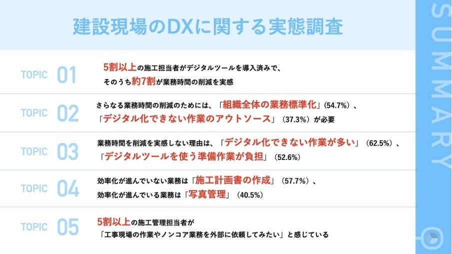 これらの結果から、建設現場ではデジタルツールの導入により生産性向上が進んでいる一方で、さらなる生産性向上のカギとなるのは、デジタルツールではカバーしづらい業務の標準化やアウトソースということが明らかになりました。