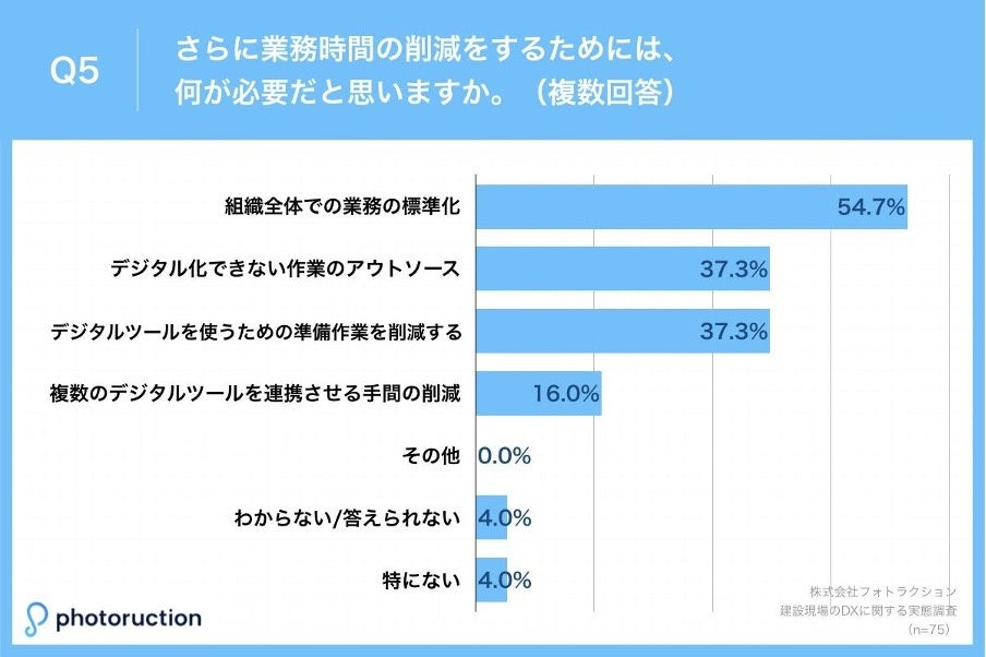 Q4で「非常にそう感じる」「ややそう感じる」と回答した方に、「Q5.さらに業務時間の削減をするためには、何が必要だと思いますか。(複数回答)」(n=75)と質問したところ、「組織全体での業務の標準化」が54.7%、「デジタル化できない作業のアウトソース」が37.3%、「デジタルツールを使うための準備作業を削減する」が37.3%という回答となりました。