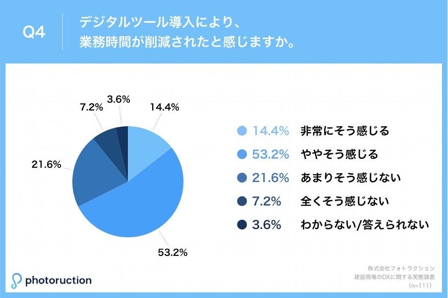 Q2で「積極的に導入している」「導入している」と回答した方に、「Q4.デジタルツール導入により、業務時間が削減されたと感じますか。」(n=111)と質問したところ、「非常にそう感じる」が14.4%、「ややそう感じる」が53.2%という回答となりました。