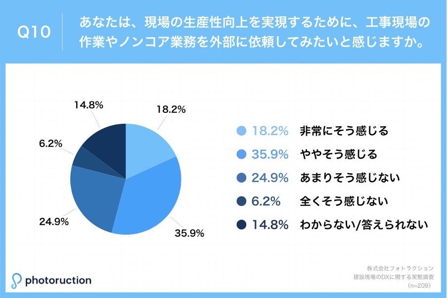 「Q10.あなたは、現場の生産性向上を実現するために、工事現場の作業やノンコア業務を外部に依頼してみたいと感じますか。」(n=209)と質問したところ、「非常にそう感じる」が18.2%、「ややそう感じる」が35.9%という回答となりました。