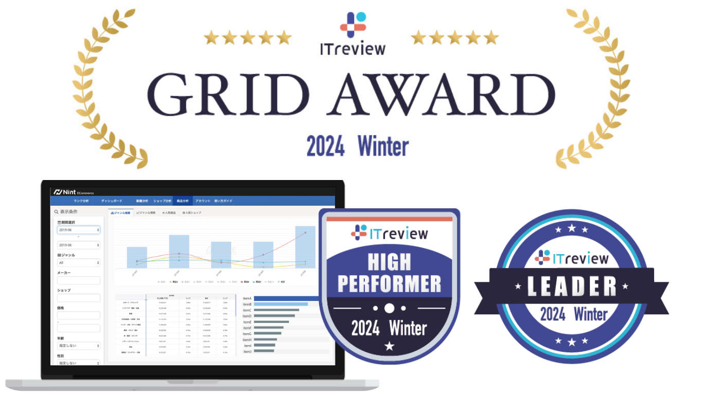 株式会社Nint(本社:東京都新宿区、代表取締役:吉野順子、以下「Nint」)が提供する日本と中国のECモールの市場動向データ「Nint ECommerce」がアイティクラウド株式会社(本社:東京都港区、代表取締役社長 兼 CEO:黒野 源太)が運営する「ITreview Grid AWARD 2024 Winter」にて、満足度と認知度が高い製品として、各賞を「ITreview Grid Award 2023 Fall」に引き続き2期連続2部門受賞したことをお知らせします。