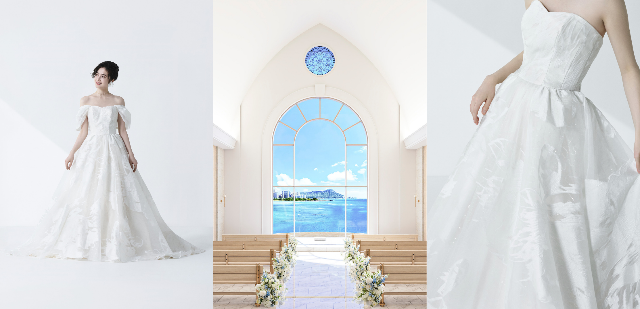 ナチュラルで柔らかな雰囲気が特徴のナウパカチャペルをイメージしたドレス。ボタニカル柄のオーガンジャガードを使用し、内側にスパンコールチュールを仕込むことで、光の当たり方によって上品な輝きを放つデザインに仕上げました。ビスチェタイプとオフショルダーの2way仕様で、リゾートの自然に溶け込む軽やかさとしなやかさを表現しています。