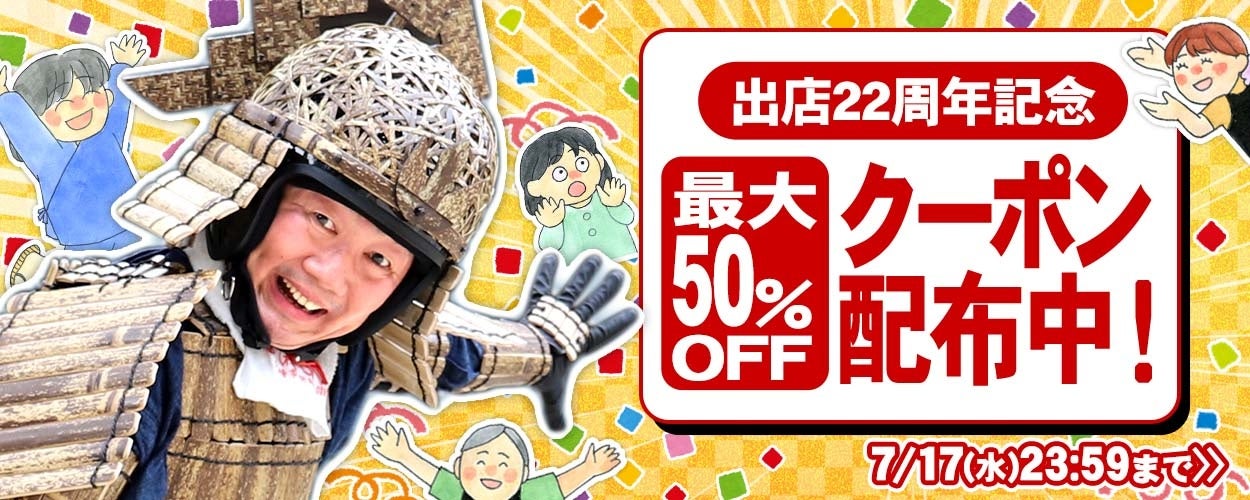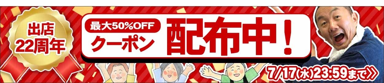 竹虎楽天市場店の出店22周年を記念し、全商品対象10,000円(税込み)以上の注文で22%OFFクーポン&人気商品5種の50%OFFクーポンを配布します!(先着あり)