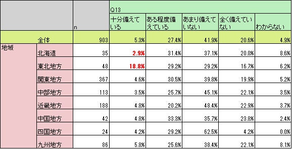 阪神淡路大震災、東日本大震災、そして今回の能登半島地震はともに冬季に発生している震災ですが、多くの家庭で防寒対策グッズの備えが不十分という結果となりました。一方、備えをしている人の多くはカイロや毛布、断熱シートといった防寒用品を備えていることがわかりました。また、地域別にみると十分に備えていると答えた割合が一番多いのは東北で18.8%、逆に一番割合が少なかったのは北海道の2.9%という意外な結果になりました。