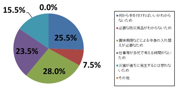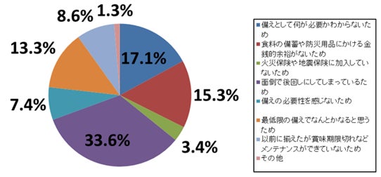 災害に対して「あまり備えていない」または「全く備えていない」と回答した人に理由を聞いたところ、面倒で後回しにしてしまっている人が33.6%と最多に。「備えの必要性を感じない」「最低限の備えでなんとかなる」と回答した人は20%以上にのぼり、1月に大規模震災が発生したにも関わらず、備えの必要性を感じない方が一定存在する結果となりました。