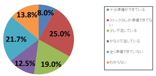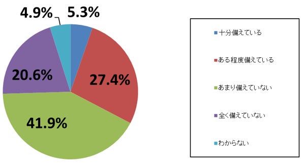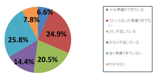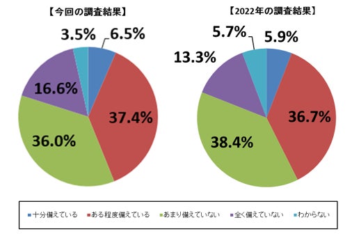 災害に対してどの程度備えられているか質問したところ、「十分備えている」と回答した人は全体の6.5%という結果でした。2年前の調査時も「十分備えている」人は5.9%と、ほぼ横ばいの結果となりました。「わからない」と回答した人を除く、全体の93.5%の人は必要十分な備えができていないというのが実態です。