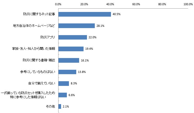 防災用品を揃えるうえで参考にした情報を尋ねたところ、最も多い回答は「防災に関するネット記事」、次いで2位は「地方自治体のホームページなど」、3位は「防災アプリ」となりました。スマホを活用して防災情報を収集している方が多いことが推察できる結果となりました。当社のアプリでもSA・PO・PO防災コンテンツをご利用いただけますので、ぜひご活用ください。