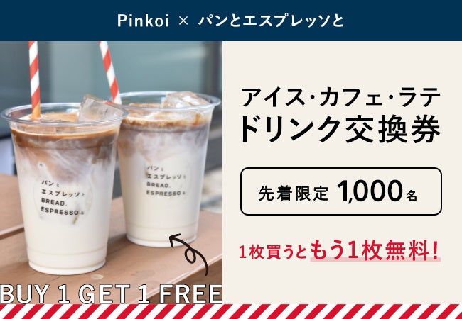 そんな「パンとエスプレッソと」とPinkoiのコラボレーションが実現。Pinkoiのアプリやオンラインサイトで「パンとエスプレッソと」のカフェで使える「アイス・カフェ・ラテ」ドリンク交換券1枚を購入で、もう1枚が無料でもらえる、お得なキャンペーンを実施します。5月25日〜6月24日の期間限定、先着1,000名なので、この機会をお見逃しなく。初夏の季節に、ひんやり豊かなカフェタイムをお楽しみください。