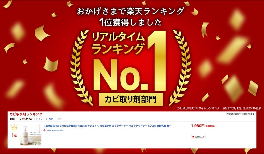 2月10日(金)より楽天市場にて販売を開始し、カビ取り剤部門リアルタイムランキング1位を獲得しました。