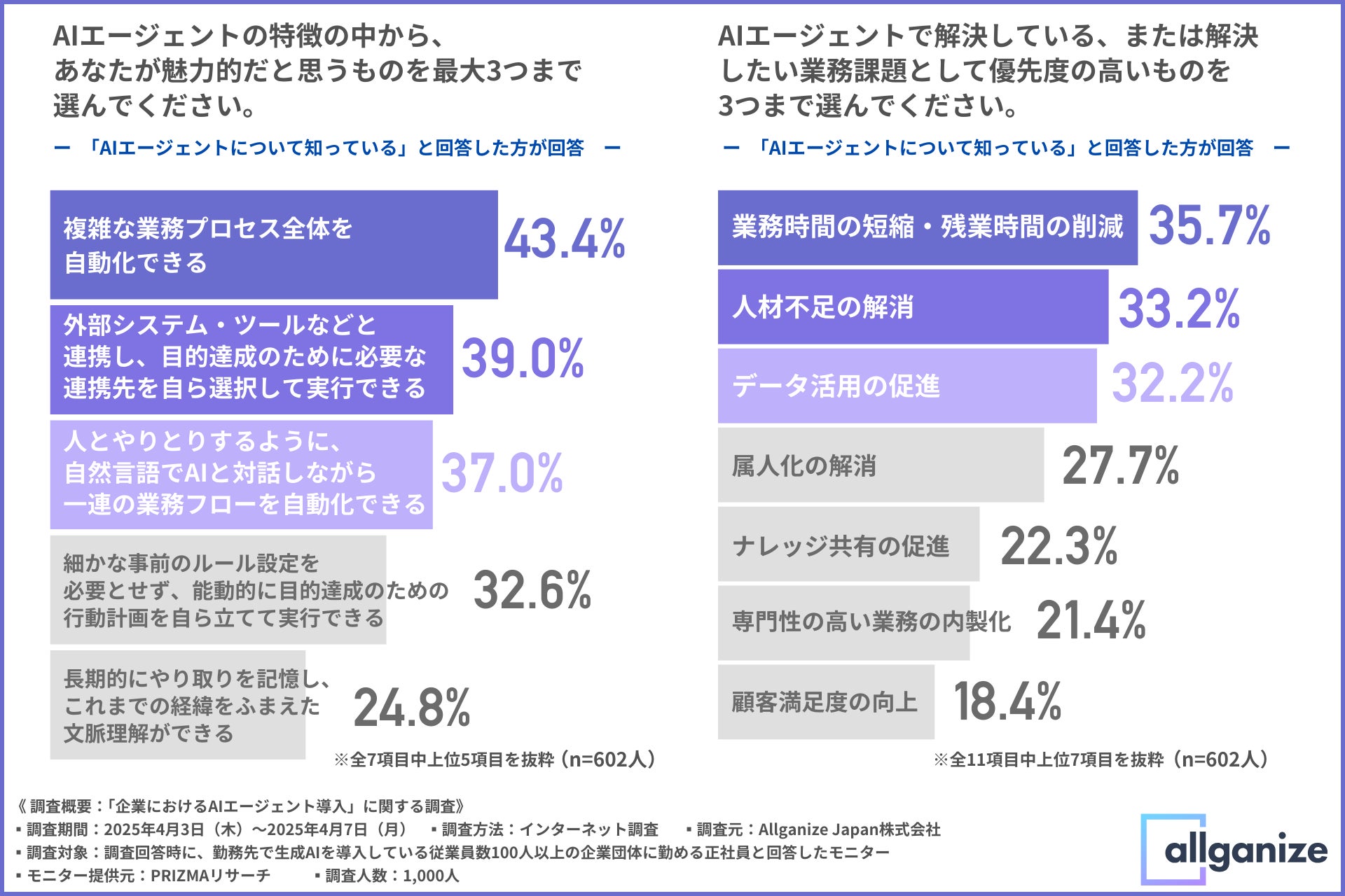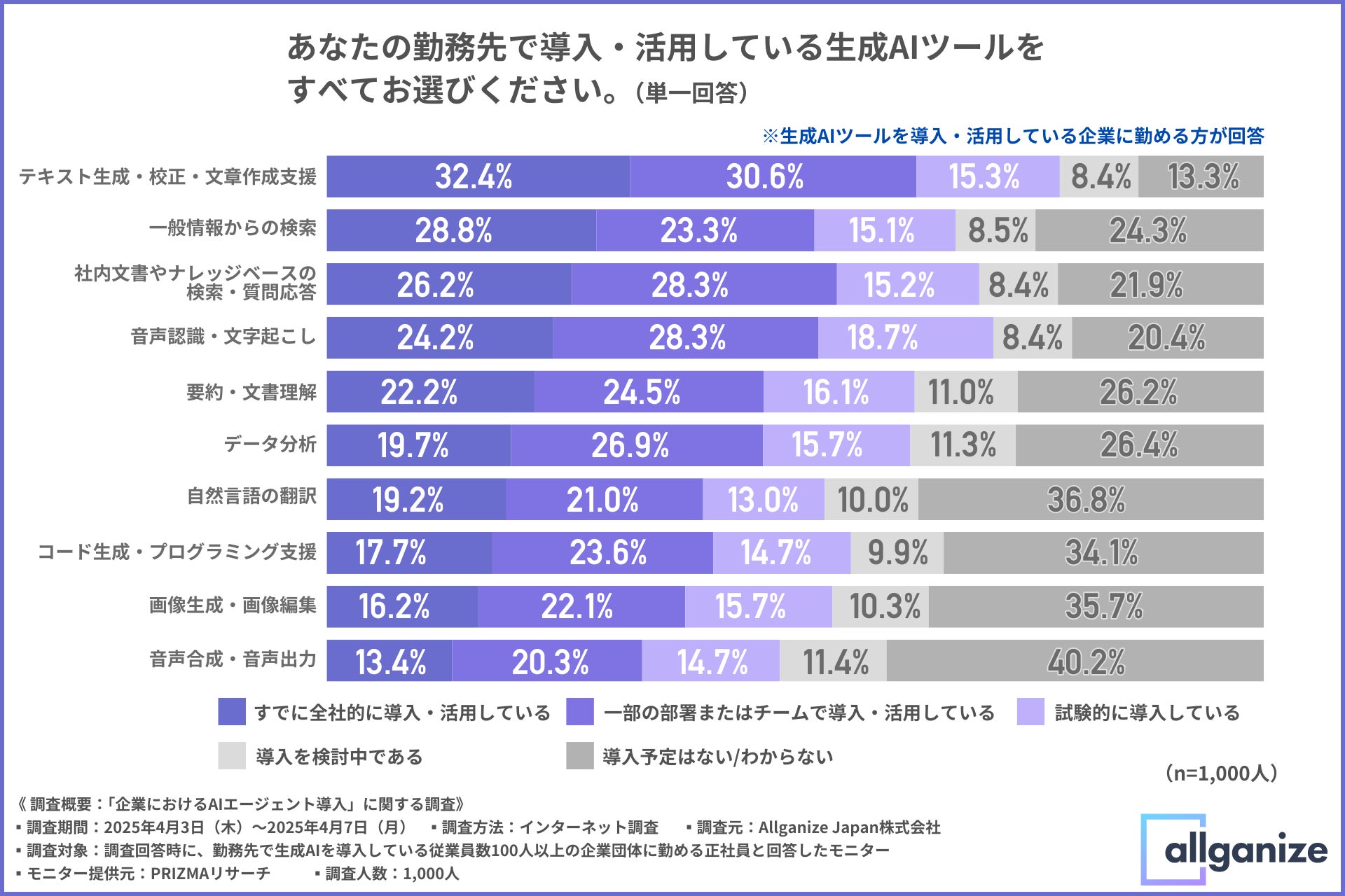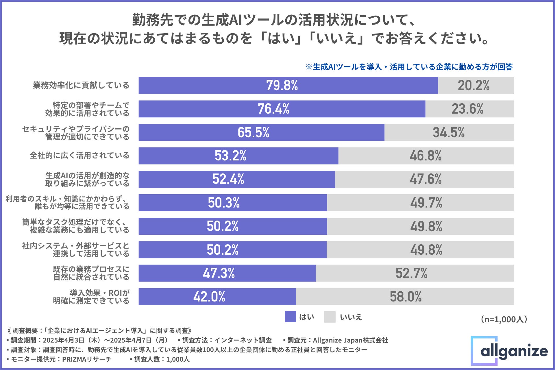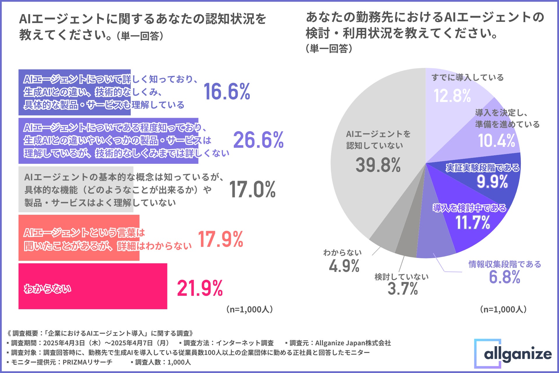 Allganize Japan株式会社(代表取締役CEO:佐藤 康雄、以下:「Allganize」)は、日本企業における生成AI活用の実態と、AIエージェント導入の動向を把握することを目的とし、生成AIを導入している従業員規模100人以上の企業団体に勤める正社員および経営層(役員クラス)1,000人を対象に「企業におけるAIエージェント導入」に関する調査を行いました。