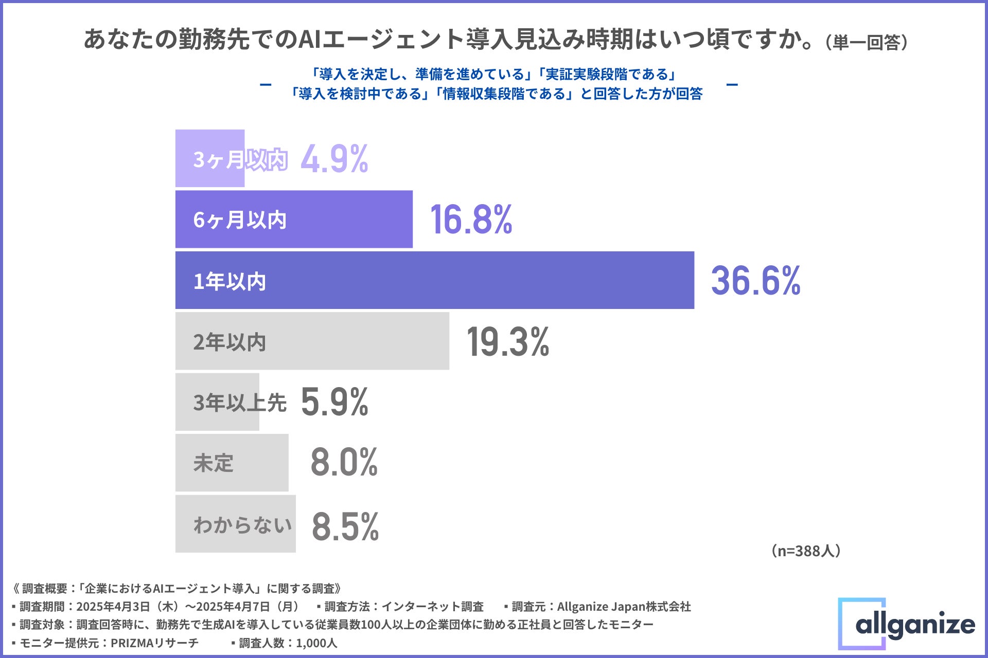 AIエージェントの認知は、生成AIを活用している人の中でも二極化。AIエージェントの認知層の6割が、1年以内の導入を計画