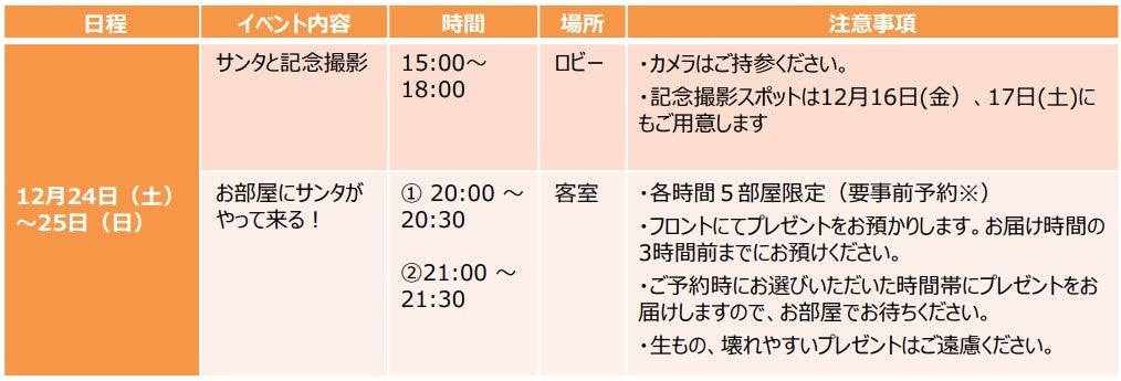 また、ロビーでは、サンタクロースと一緒にお写真をお撮りいただける記念撮影スポットをご用意します。ご家族でとっておきのクリスマスをお過ごし下さい。