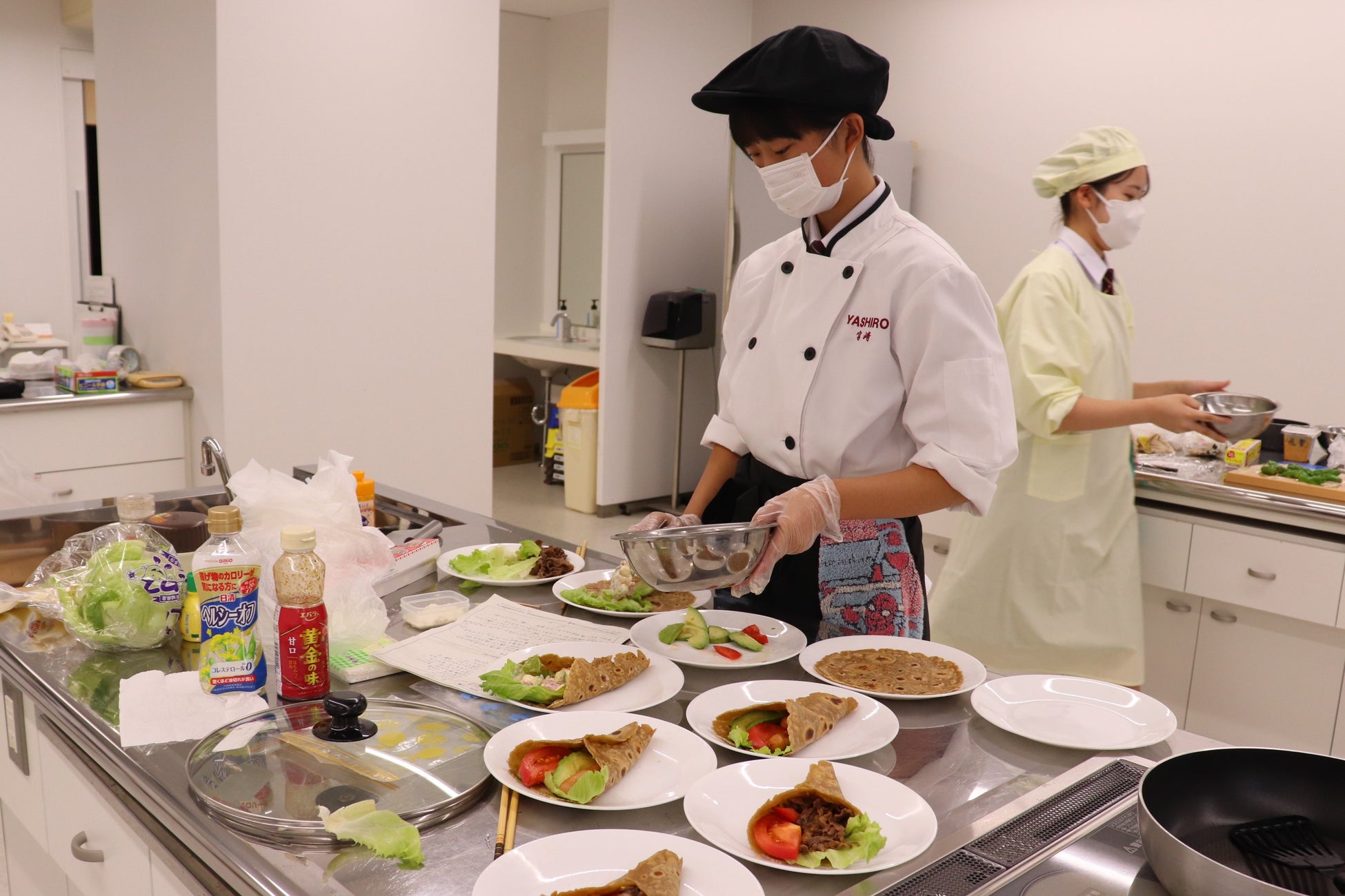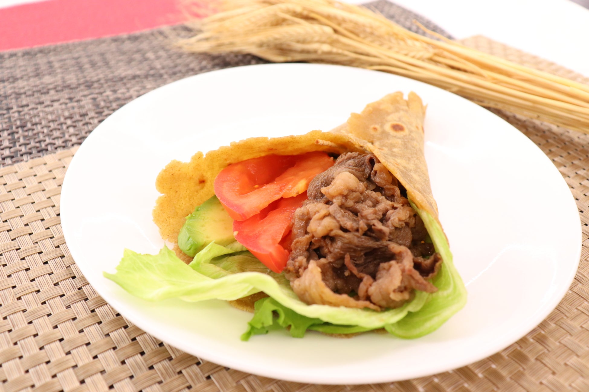 トルティーヤの生地をもち麦粉で作りました。卵などを加えることで、しっとりとした生地になるよう工夫しました。審査時は、牛肉やソーセージ、サラダなど、それぞれに具材を変えて仕上げ、どんな具材にも合うことをアピールしました。