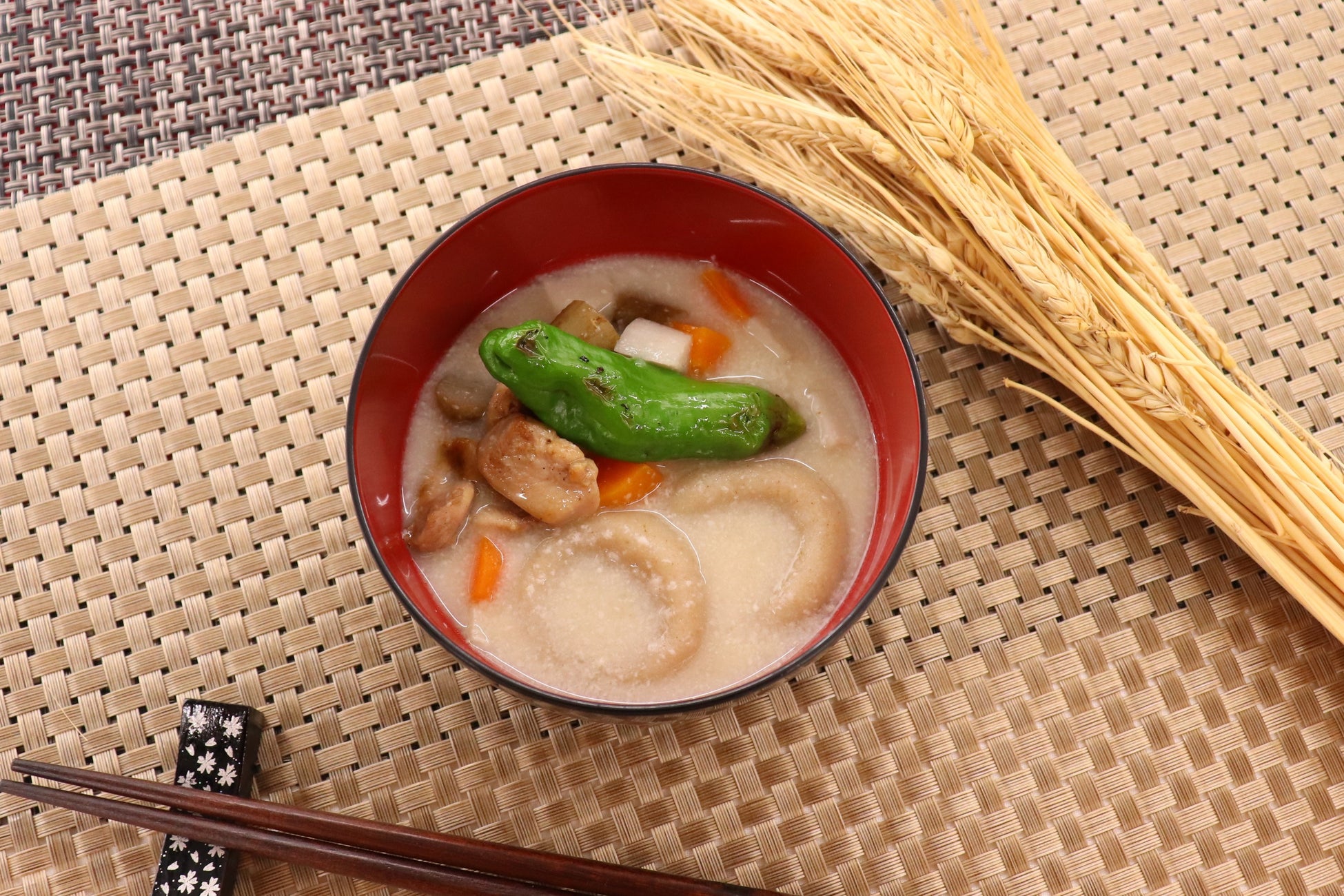 もち麦粉100%で作ったモチモチのすいとんを粕汁に入れました。地域が酒米山田錦の産地であることから、酒粕を使用し、播州百日鶏を具材に入れることで、北播磨の地域の恵みが詰まったレシピになりました。鶏は先に焼いて風味を引き立たせることで、粕汁の良いアクセントになっています。