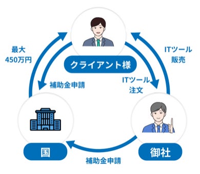 たとえば、貴社がITサービスを販売する際、購入者に最大450万円・経費の1/2~3/4の補助金が出ます!