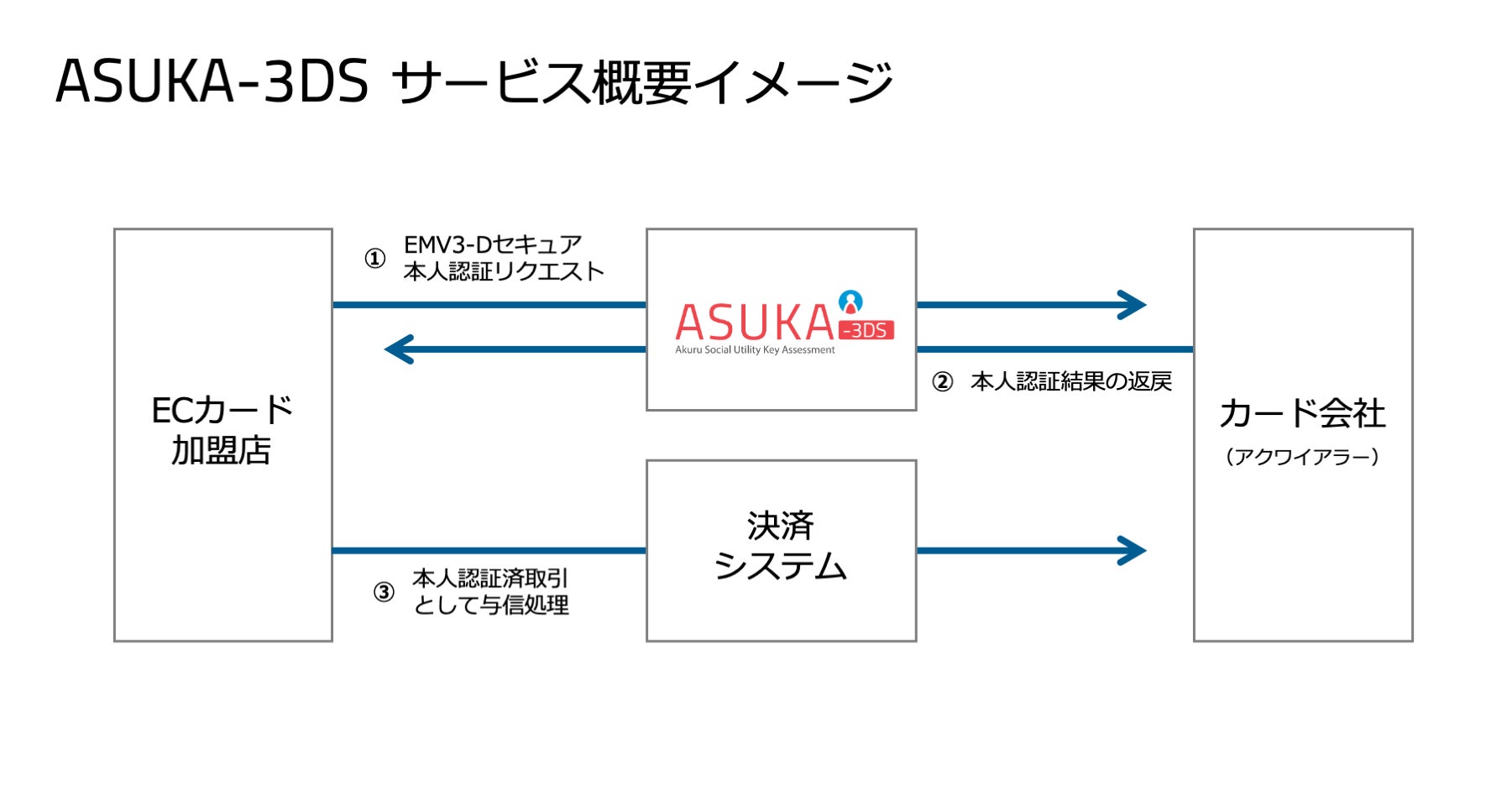 「ASUKA-3DS」は、システム開発の負荷、導入後の運用・保守にかかるEC加盟店の負荷を抑えた形でこのEMV 3-Dセキュアを提供することに加え、EMV 3-Dセキュアの導入効果を最大化するためのサポートも併せて提供する、新しいサービスです。