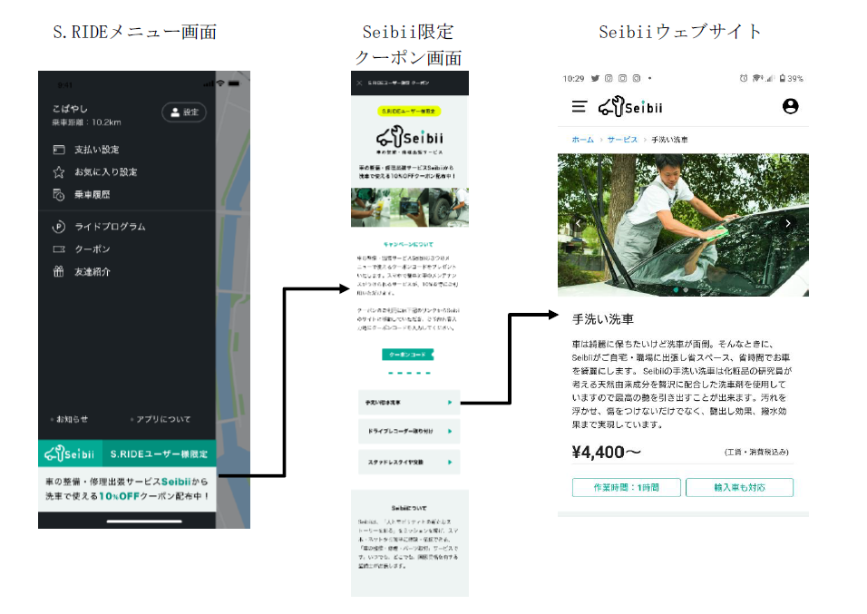 S.RIDE株式会社(本社:東京都台東区、代表取締役:西浦賢治、以下、S.RIDE)と株式会社Seibii(本社:東京都港区、代表取締役:佐川悠、以下、Seibii)は、S.RIDEが提供するタクシーアプリ“S.RIDE”の会員に対し、車の洗車・整備・修理・パーツ取り付け等の出張サービス“セイビー”のS.RIDE会員向け優待サービスを2021年12月23日より、開始します。