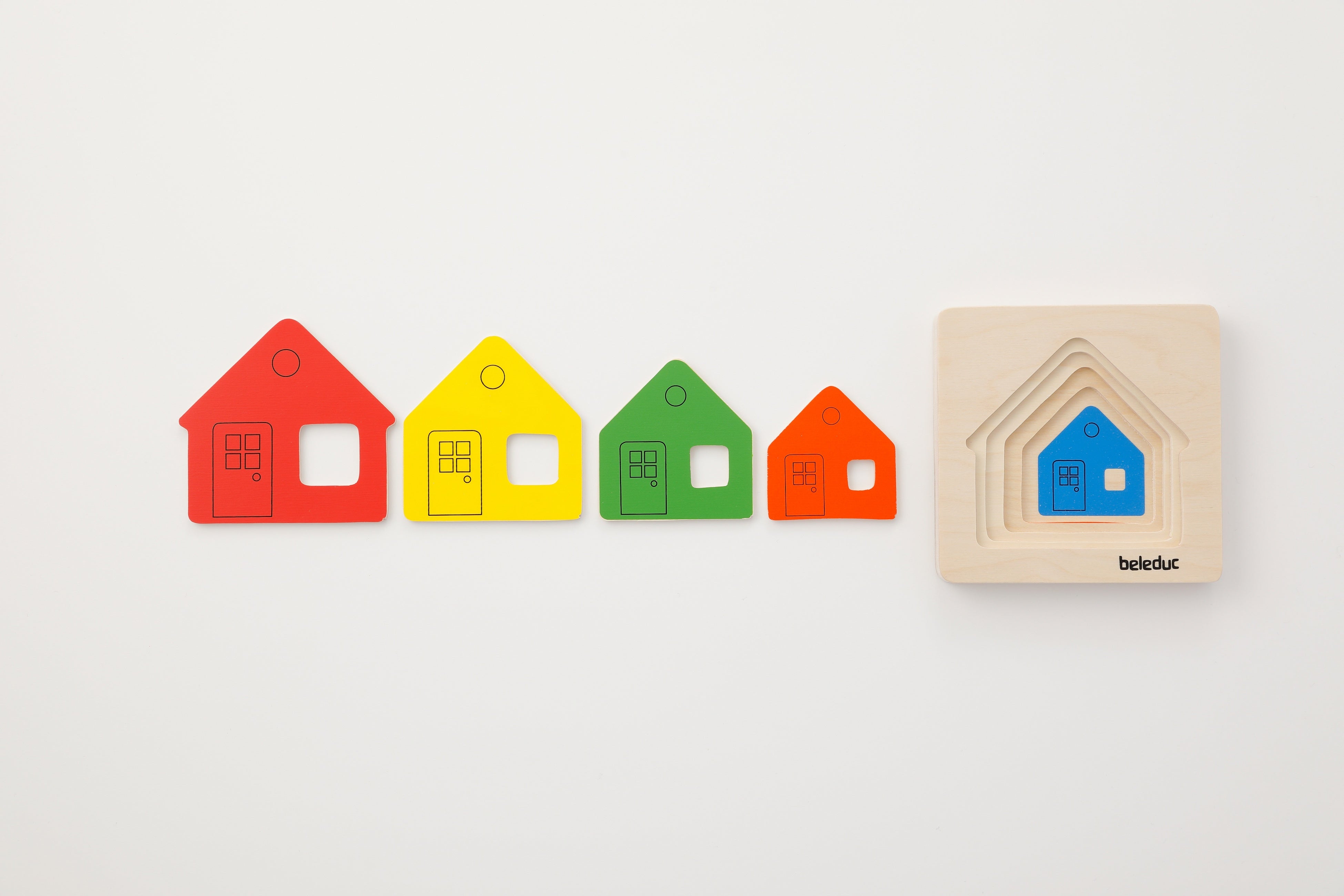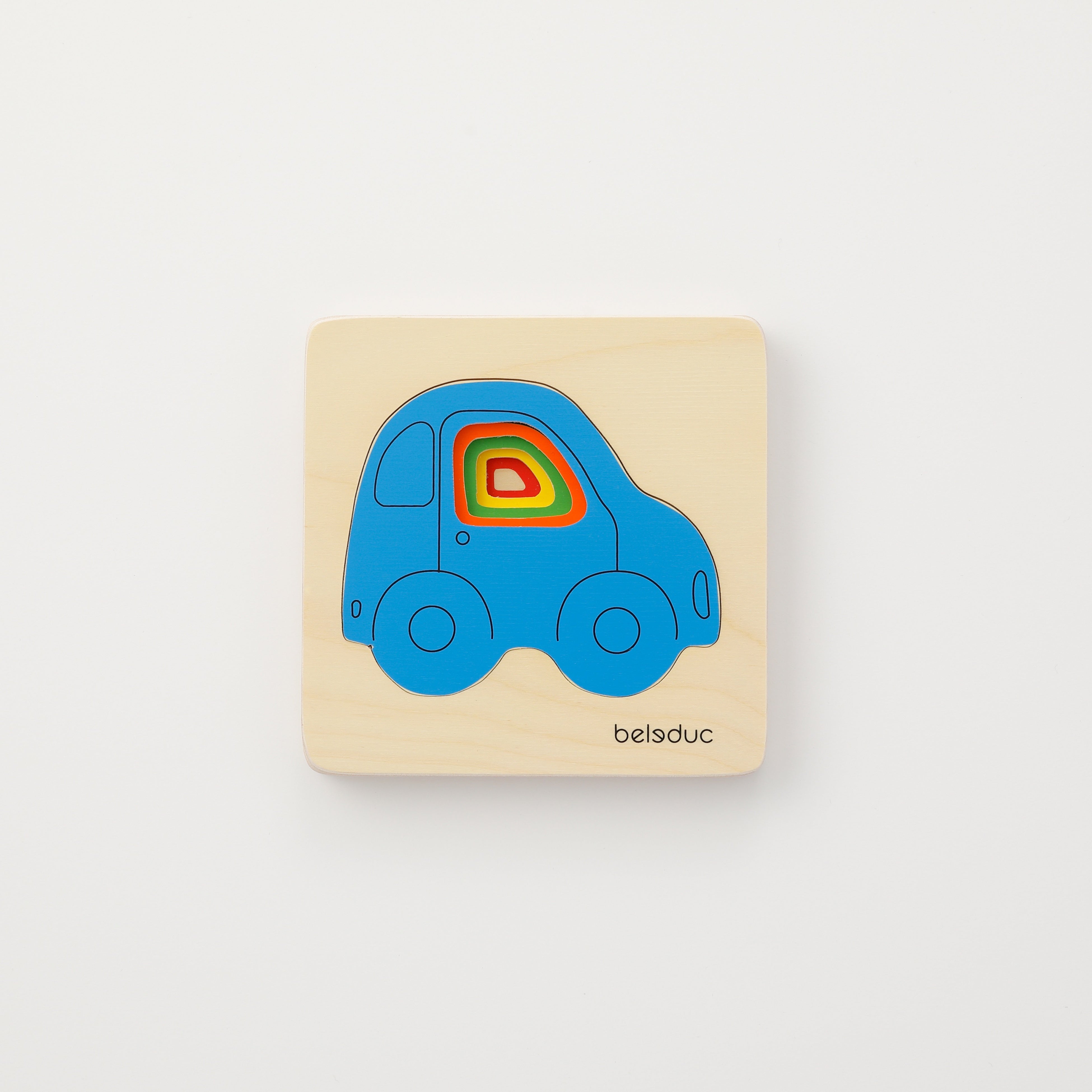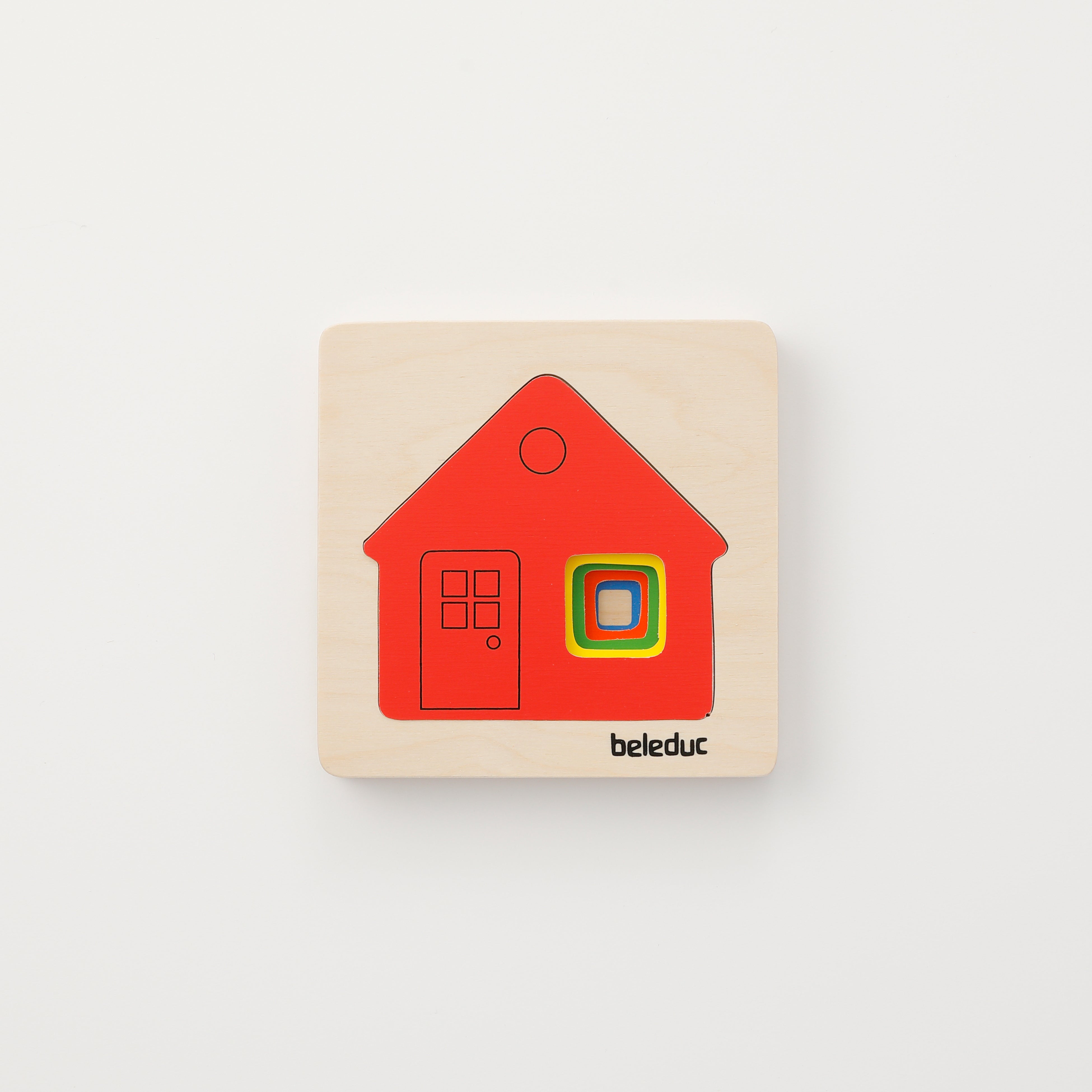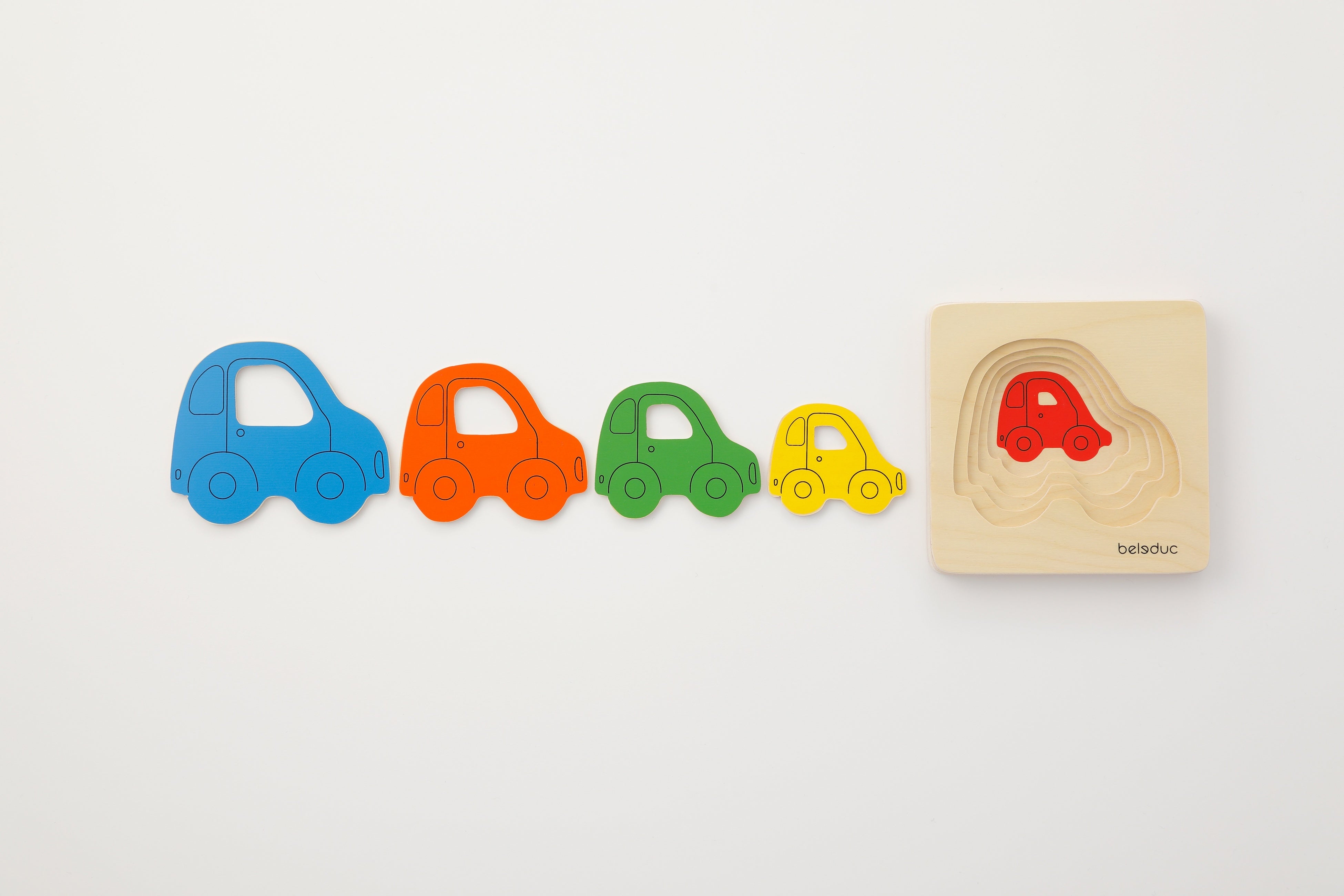 おうちやくるまのピースを重ねるレイヤードパズル。4つのピースを見比べて小さいものから順にフレームにはめましょう。完成すると、窓には奥行きのある色の重なりが。シンプルながら色や木の味わいを楽しめるデザイン性の高いパズルで、ギフトにもおすすめです。