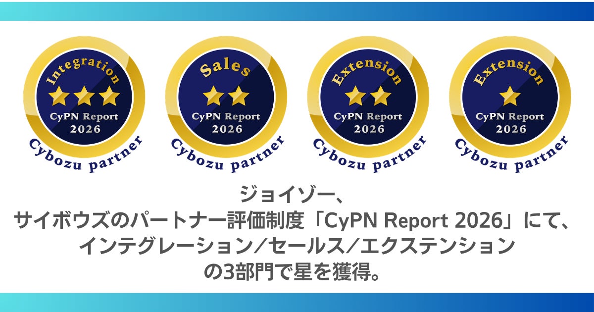 ジョイゾー、サイボウズのパートナー評価制度「CyPN Report 2026」にて、インテグレーション/セールス/エクステンションの3部門で星を獲得。インテグレーション部門では最高評価を獲得