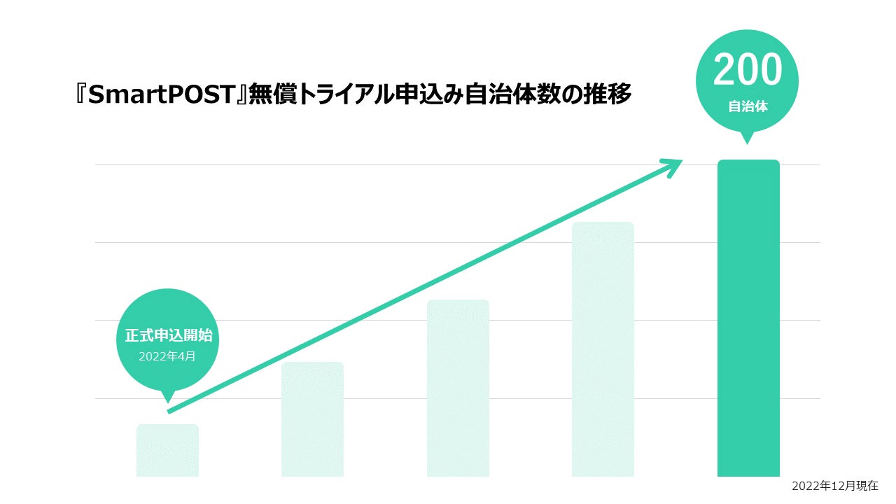 xIDが提供する「SmartPOST」は、無償トライアル第1弾(募集期間:2022年4月1日~7月31日の期間、100自治体まで受付)の受付を行い、7月時点で100を超える自治体からお申込みいただきました。ご好評につき、無償トライアル第2弾(募集期間:2022年8月1日~2023年3月31日の期間※)の申込み受付を開始したところ、2022年12月22日時点で、第1弾との累計で200を超える自治体より申込みをいただきました。