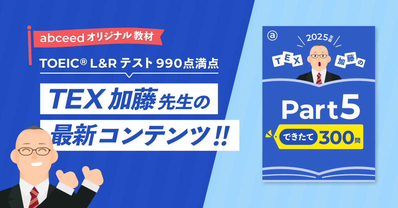 そしてこの度、TEX加藤先生執筆のabceedオリジナル教材、『TOEIC L&R テスト TEX加藤の Part 5 できたて 300問』の掲載を開始したことを報告させて頂きます。