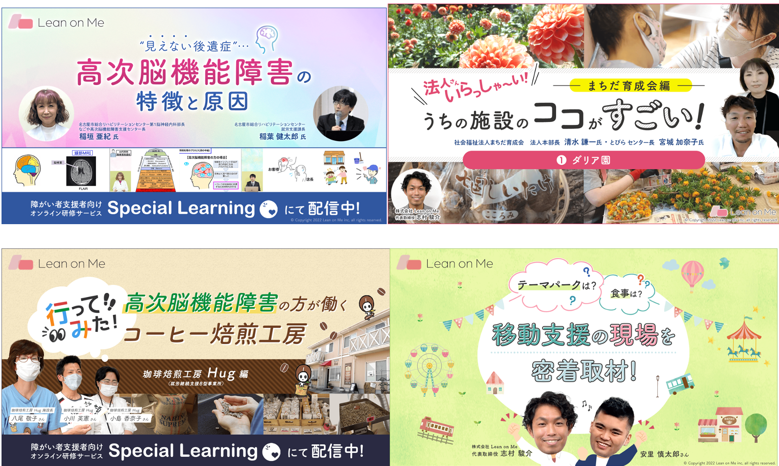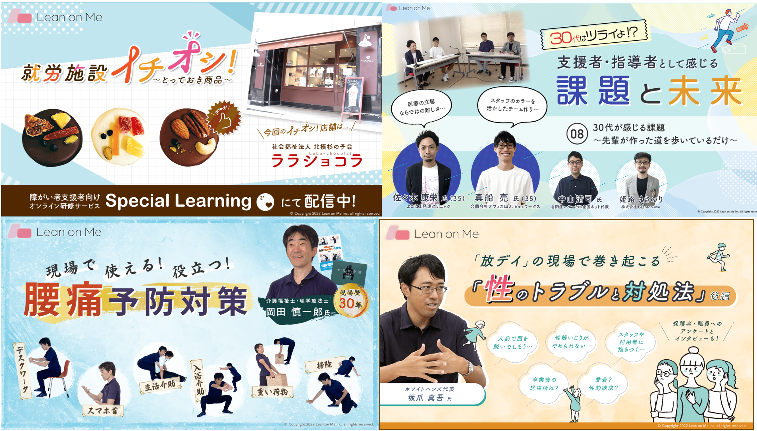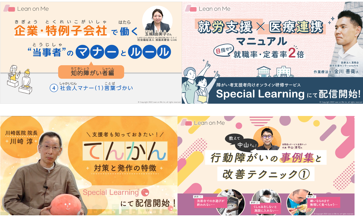 インクルTech※(インクルテック)で社会課題を解決する「株式会社Lean on Me」(リーンオンミー、本社:大阪府高槻市、 代表取締役:志村駿介)は、障がい福祉に関わる方を対象に提供する障がい福祉専用eラーニング「Special Learning(スペシャルラーニング)」におけるコンテンツ数が1,000本を突破しました。