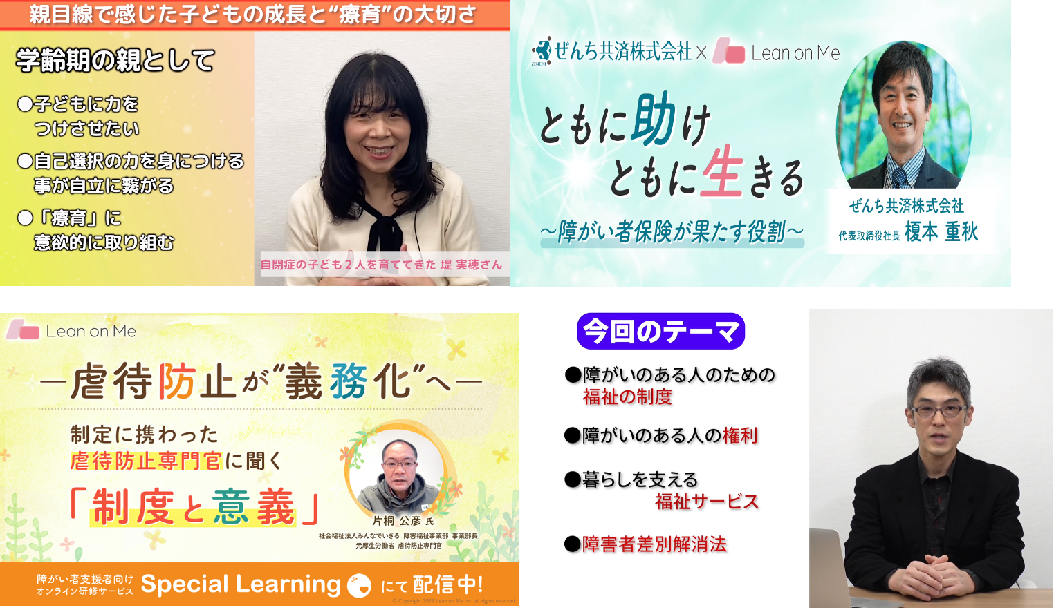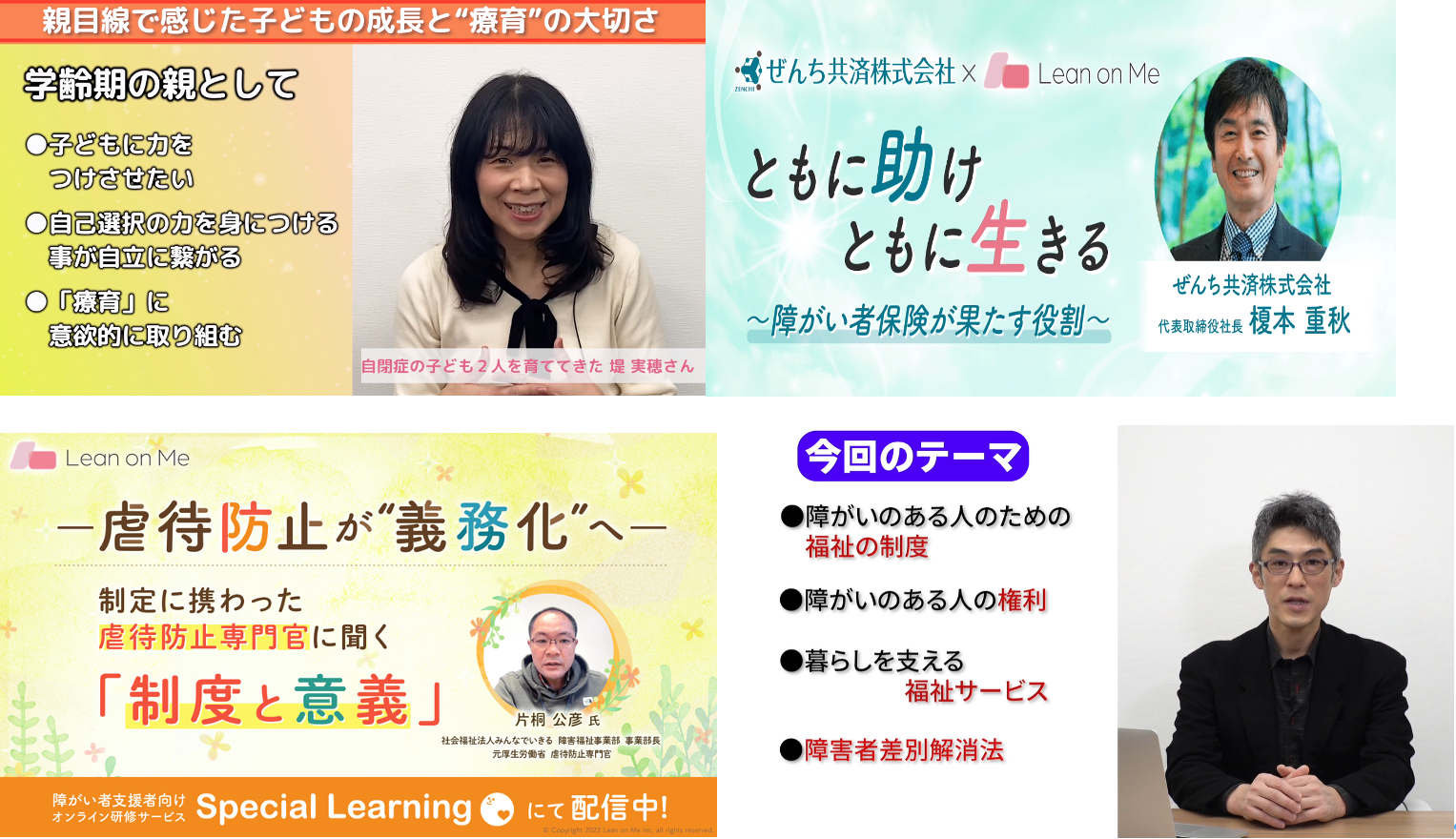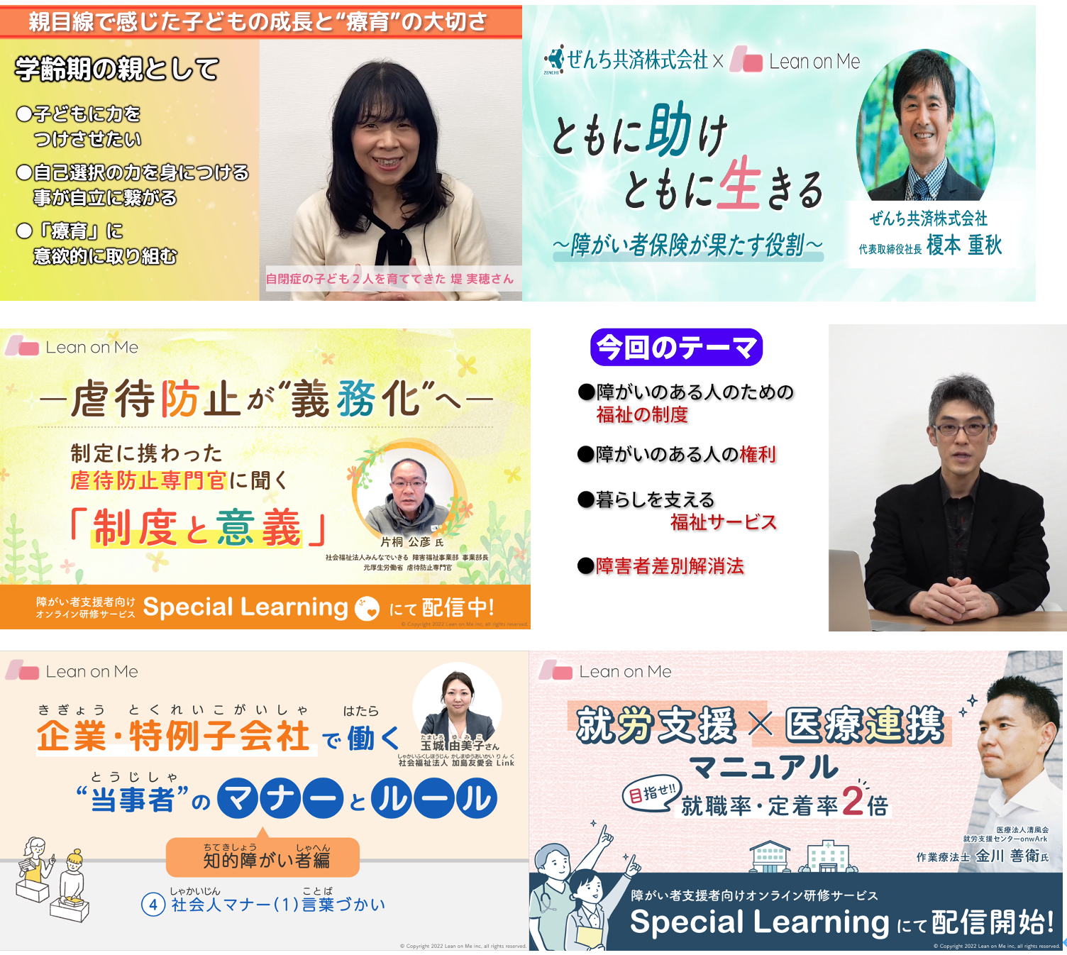 インクルTech※(インクルテック)で社会課題を解決する「株式会社Lean on Me」(リーンオンミー、本社:大阪府高槻市、 代表取締役:志村駿介)は、障がい福祉に関わる方を対象に提供する障がい福祉専用eラーニング「Special Learning(スペシャルラーニング)」におけるコンテンツ数が1,000本を突破しました。