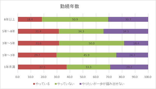 ・一方、勤続年数5年~8年で「やってみたいが一歩踏み出せない」が34.3%とやや高い傾向が伺える